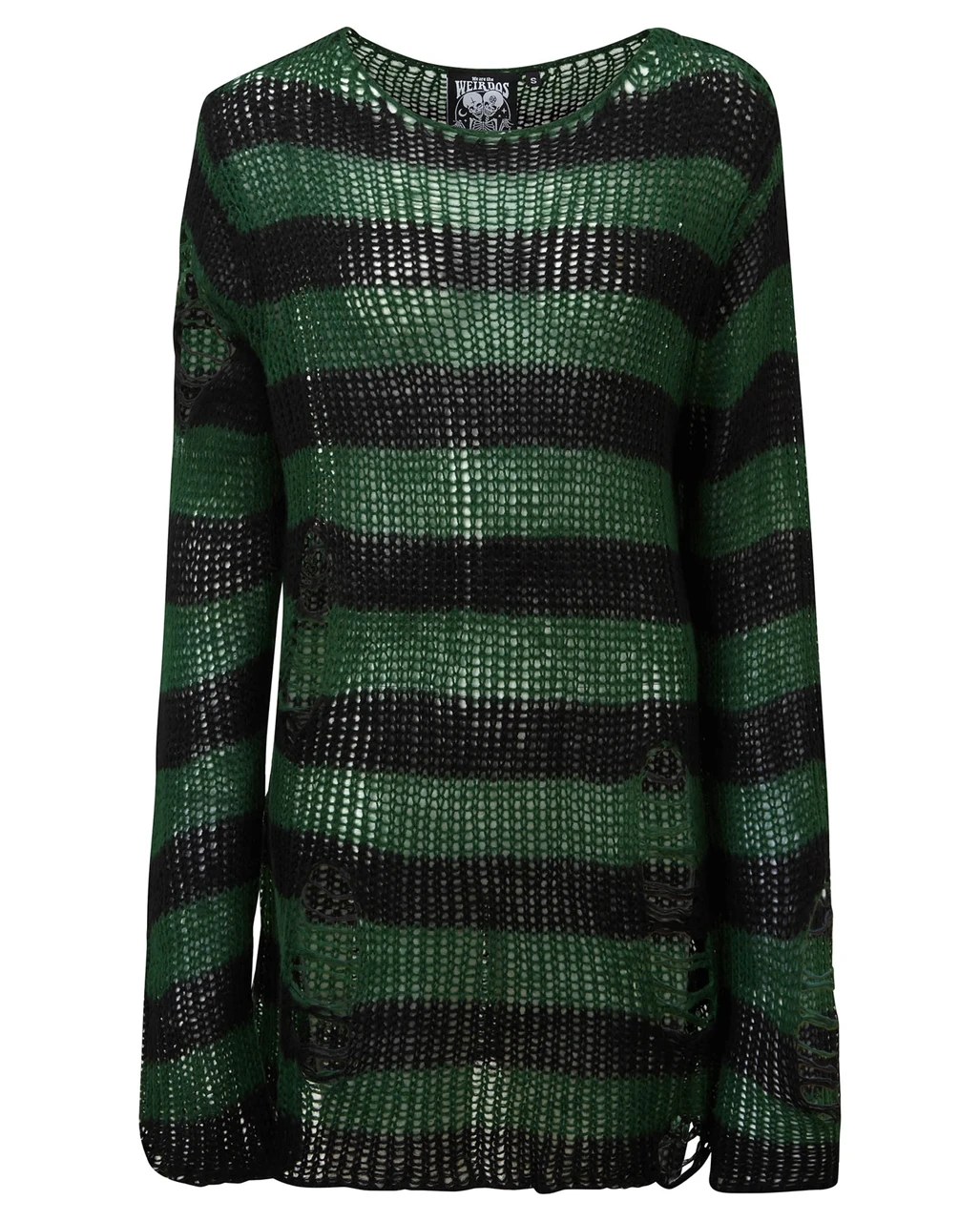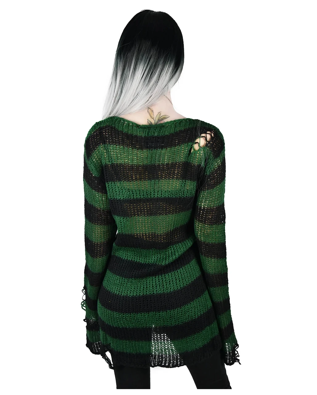 Unser Absinthe Strickpullover KILLSTAR in grün-schwarz gestreiftem Design ist eine echtes Statement und ein Ausdruck deiner lässigen Einstellung. Du kannst den Unisex Pulli zur Leggings oder über die Jeans tragen und siehst immer entspannt und ganz wie du selbst aus. Auch an ein bestimmtes Geschlecht ist dieser einzigartige Gothic Pullover nicht gebunden. Tragt ihn abwechselnd als Paar oder zeigt euch im Partnerlook. Was immer ihr wollt!