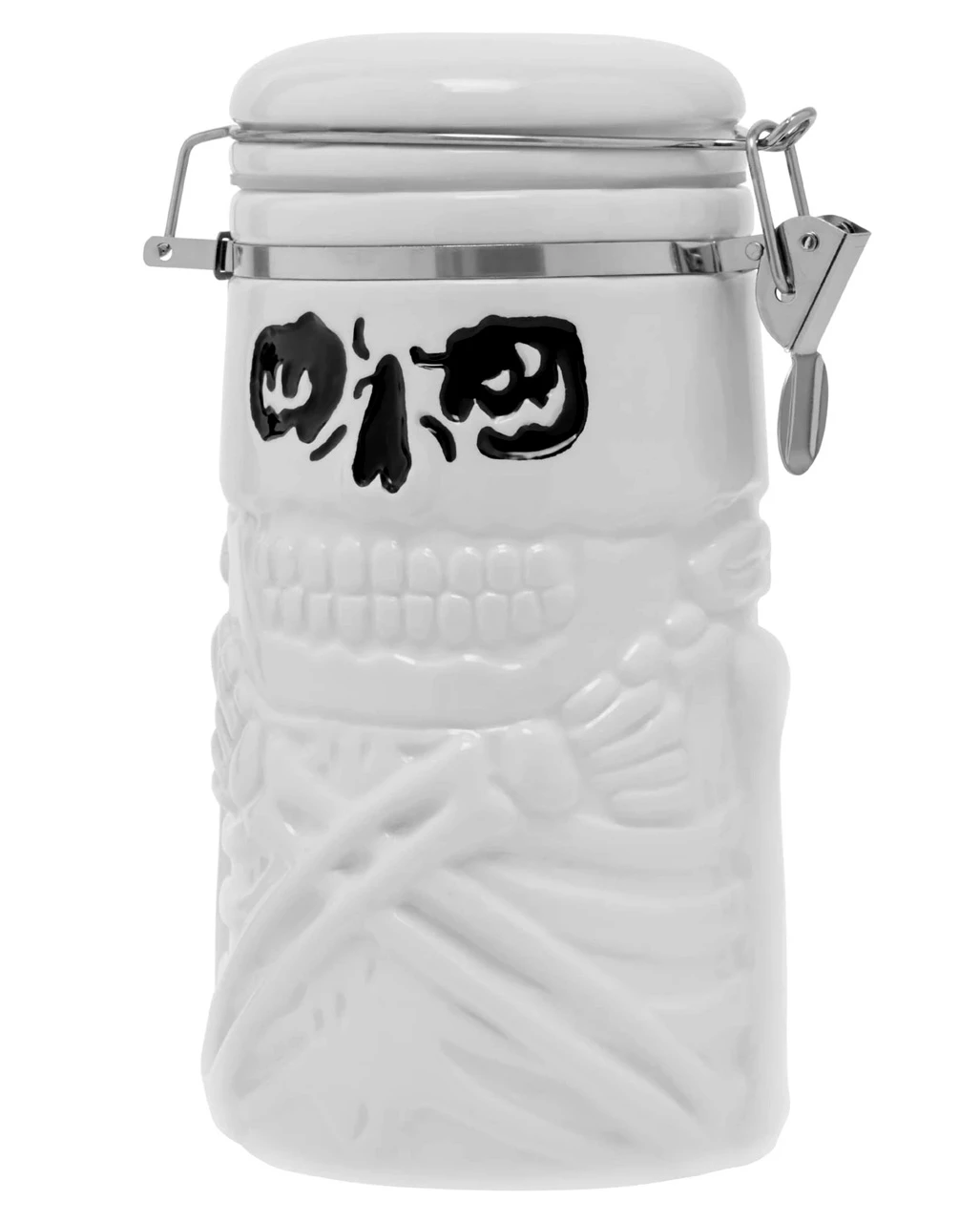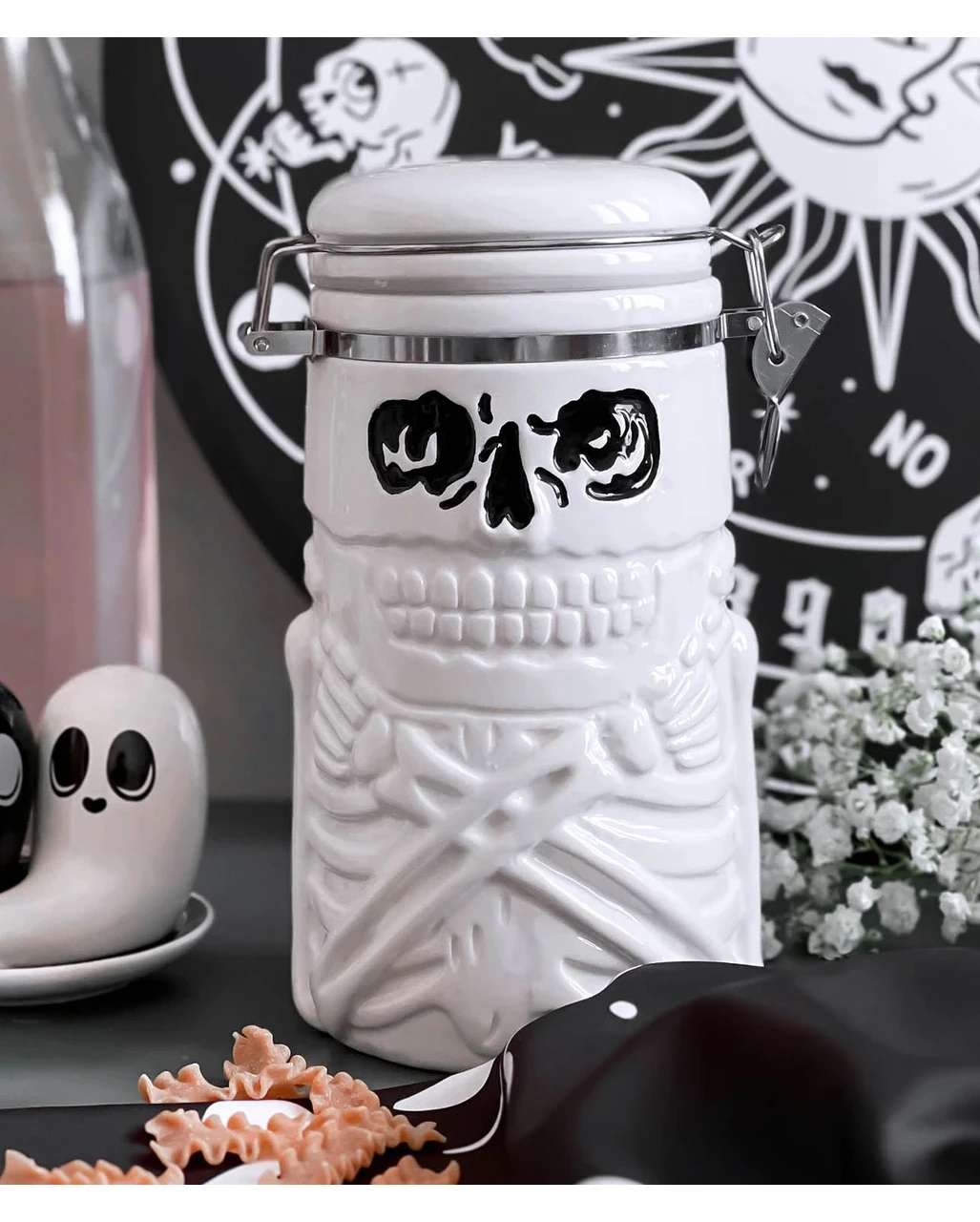 Mit der Artifact Keramik Dose von KILLSTAR bringst du düsteres Flair in deine Gothic Küche. Cookies, Bonbons und andere Halloween Süßigkeiten finden im Skelett Keksbehälter ein hübsches Plätzchen. Der KILLSTAR Küchenartikel eignet sich auch ideal als Geschenk für Gothics, Wicca Fans und Hexen!