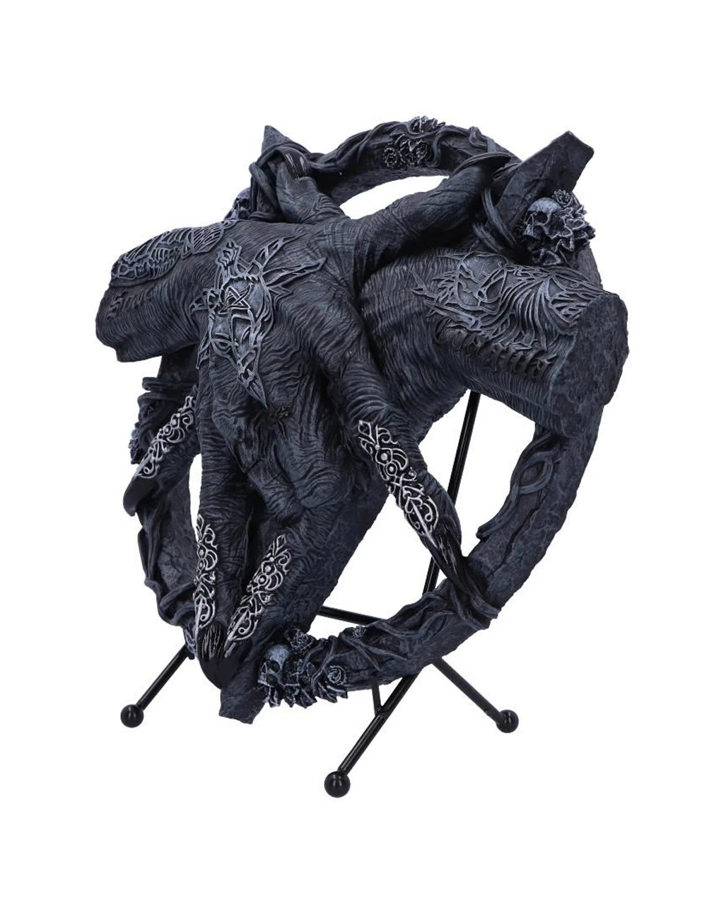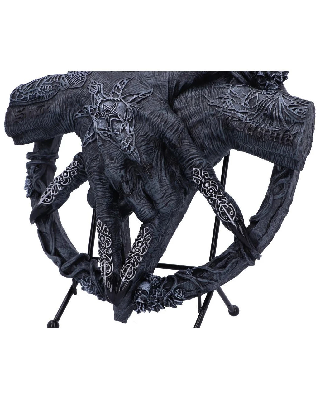 Mit dem Baphomet Hände mit Pentagramm Aufsteller hast du eine hochwertige Gothic Deko, die einen okkulten Blickfang darstellt. Verschlungene Silberverzierungen bedecken die verdorrten Hände, während die lateinischen Worte Solve (trennen) und Coagula (zusammenfügen) auf den Handgelenken der Monster prangen. Als Stütze dient ein Pentagramm, das mit verschlungenen Ranken umwickelt und mit kleinen menschlichen Schädeln bedeckt ist. Gegossen aus feinstem Polyresin, bevor es sorgfältig von Hand bemalt wurde, sind die Baphomet Hände mit Pentagramm als Aufsteller das perfekte Gothic-Wohnaccessoire. Das Ornament wird einem kleinen Ständer geliefert, um eine perfekte Platzierung zu ermöglichen.