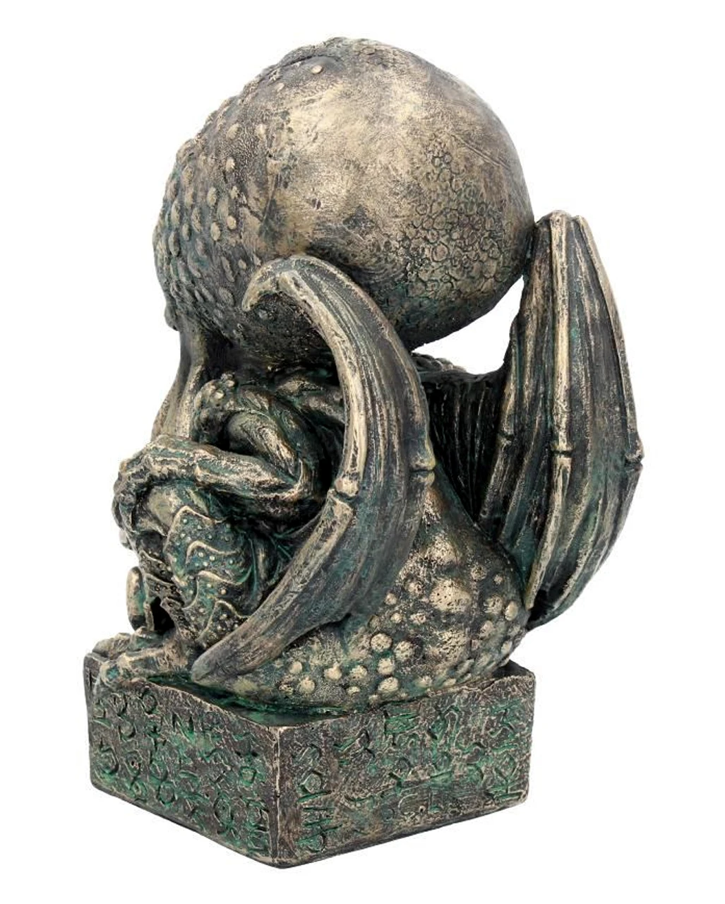 Die Cthulhu Figur weist eine Größe von ca. 17 cm auf und entspricht den Beschreibungen im Necronomicon. Aus feinstem Polyresin gegossen, beeindruckt die Cthulhu-Figur durch ihre detaillierte Verarbeitung: Schuppen, Knochen, Tentakel und Gesichtszüge des „Großen Alten“ lassen die mystische Tintenfisch-Figur zu einem absoluten Hingucker werden. Platziert auf einem steinernen Sockel ruht Cthulhu, darauf wartend, R`Lyeh wieder zu verlassen und seine Schreckensherrschaft erneut zu beginnen. Die Cthulhu-Figur ist in einem goldenen Messing Farbton verarbeitet. Darunter schimmert eine kupfergrünliche Nuance leicht durch, was die maritime Lebenswelt der Sagengestalt unterstreicht. Noch mehr mystische Deko- und Fanartikel wie die 4er Set Gothic Drachen stehend und den Gothic Totenschädel Kelch haben wir ebenfalls im Karneval-Universe.de!