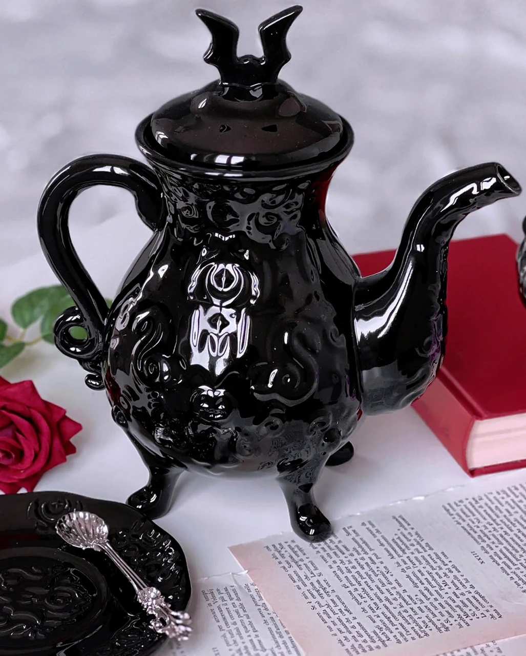Wenn der Hexenzirkel zum Nachmittagstee lädt, sind alle Zauberinnen in heller Aufruhr. Schließlich bietet solch eine illustre Runde jede Menge Klatsch und Tratsch. Deinen Tee oder Kaffee genießt du hierfür aus der Daemon Teekanne von KILLSTAR. Die schwarze Kanne ist im viktorianischen Stil gehalten und kommt mit einem dekorativen Deckel daher. Nun fehlen nur noch passende Tassen sowie Untersetzer, und dein Gothic Geschirr ist komplett.
