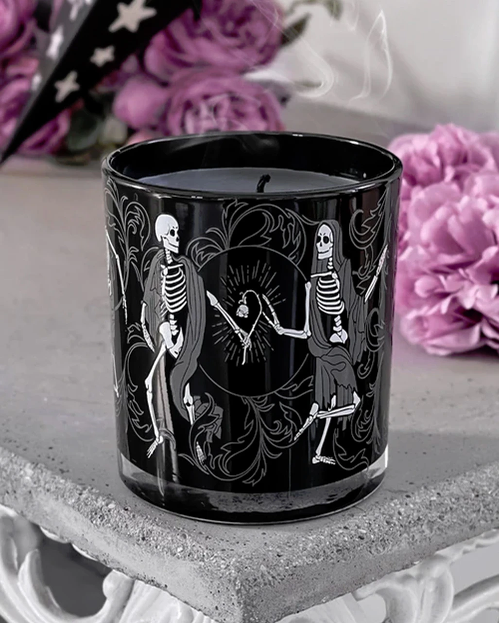 Die Danse Macabre Glas Kerze KILLSTAR ist eine beduftete Statement Kerze für Fans von Halloween Homeware. Diese Gothic Kerze besteht aus schwarzem Sojawachs und befindet sich in einem bedruckten Glas. Das Motiv zeigt eine Szenerie mit tanzenden Gerippen, die in zerfetzte Tücher gehüllt sind. Zwischen ihnen steht eine Sanduhr, in der die Zeit langsam entrinnt. Eine Wohndeko, die dich an die Endlichkeit des Lebens erinnert… Entdecke ebenfalls die Lemax Spooky Town – Lange nicht gesehen!