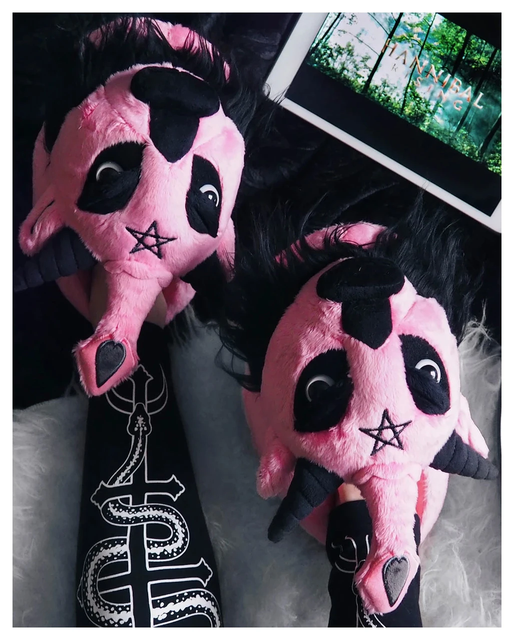 Flauschige knallrosa Hausschlappen mit Baphomet Motiv