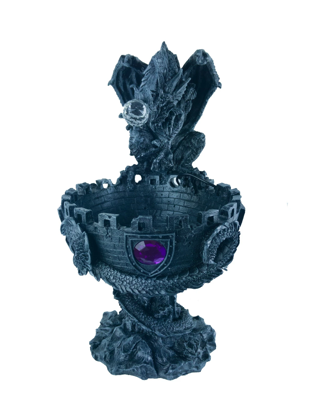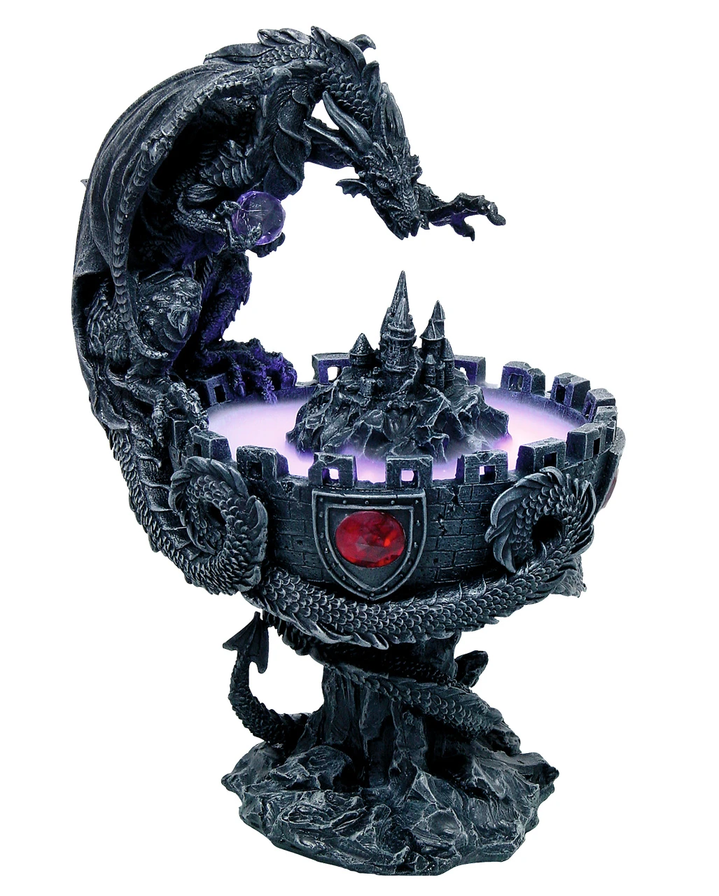 Verschenke den Drachenbrunnen mit Vernebler & Burg und du wirst jemanden sehr glücklich machen. Die Drachen Deko Figur ist aus hochwertigem Polyresin und begeistert mit feinen Details wie dem Gesicht oder den gut erkennbaren Schuppen auf der Drachenhaut, alles von Hand bemalt. Neben dem Deko Drache ist der Brunnen natürlich ebenso faszinierend anzusehen. Er wechselt dank LED Beleuchtung die Farben und zeigt in seinem Innern eine alte Burg.