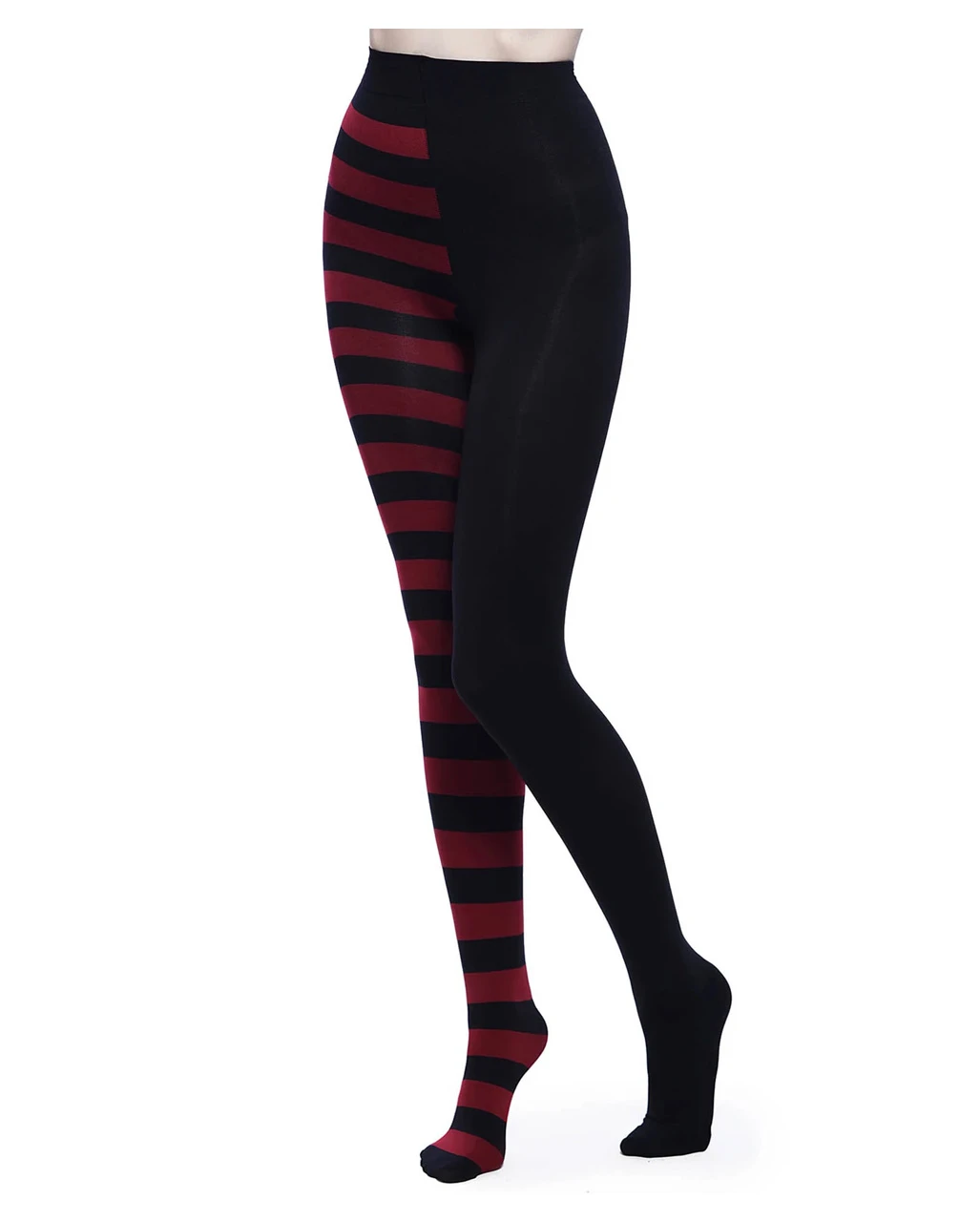 Pimpe damit deinen Bestand an Gothic Mode Accessoires. Die Ella Strumpfhose mit Streifen KILLSTAR ist perfekt, um damit deiner Kleidung einen frechen Hauch von Farbe und Drama hinzuzufügen! Die blickdichte Nylon Strumpfhose ist einem Bein komplett schwarz, das andere Bein der Strumpfhose ist zusätzlich mit roten Streifen versehen. Die Gothic Strumpfhose passt zu allem, sieht aber vor allem zu Skater-Kleidern und Röcken hinreißend aus!