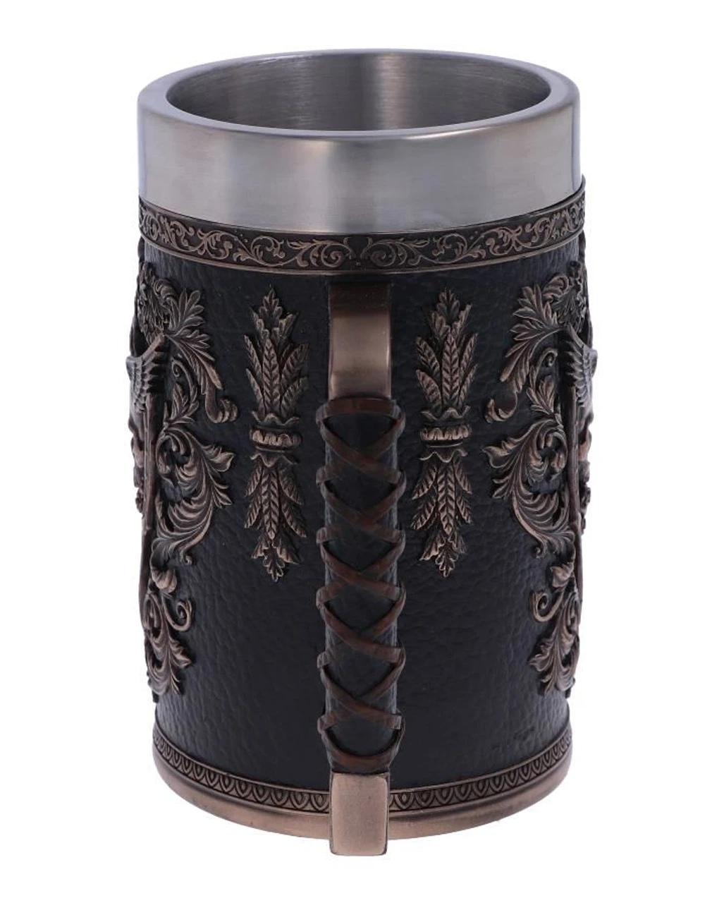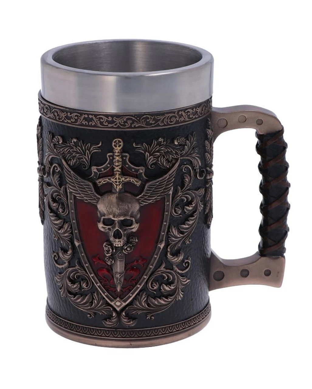 Der Körper des Kruges weist ein sattes, glanzloses Schwarz in Lederoptik auf. Auf der Seite des Gothic-Humpens befindet sich ein kunstvolles Siegel, das einen Schädel darstellt, durch dessen Mitte die Klinge eines langen Schwertes in Richtung Boden sticht. Aus der Spitze des Schädels ragen Engelsflügel, die in den Himmel aufsteigen. Ein ledrig anmutender, runder Griff sorgt für optimalen Halt. Der Et Alas Mortis Totenkopf Krug wird mit einem herausnehmbaren Edelstahleinsatz für eine einfache Reinigung geliefert. Noch mehr Fanatsy-Dekorationen wie der Carpe Noctem Vampir Fledermaus Weinkelch und die Schwarze Ornament Serviette 15 St. haben wir ebenfalls im Karneval-Universe.de!