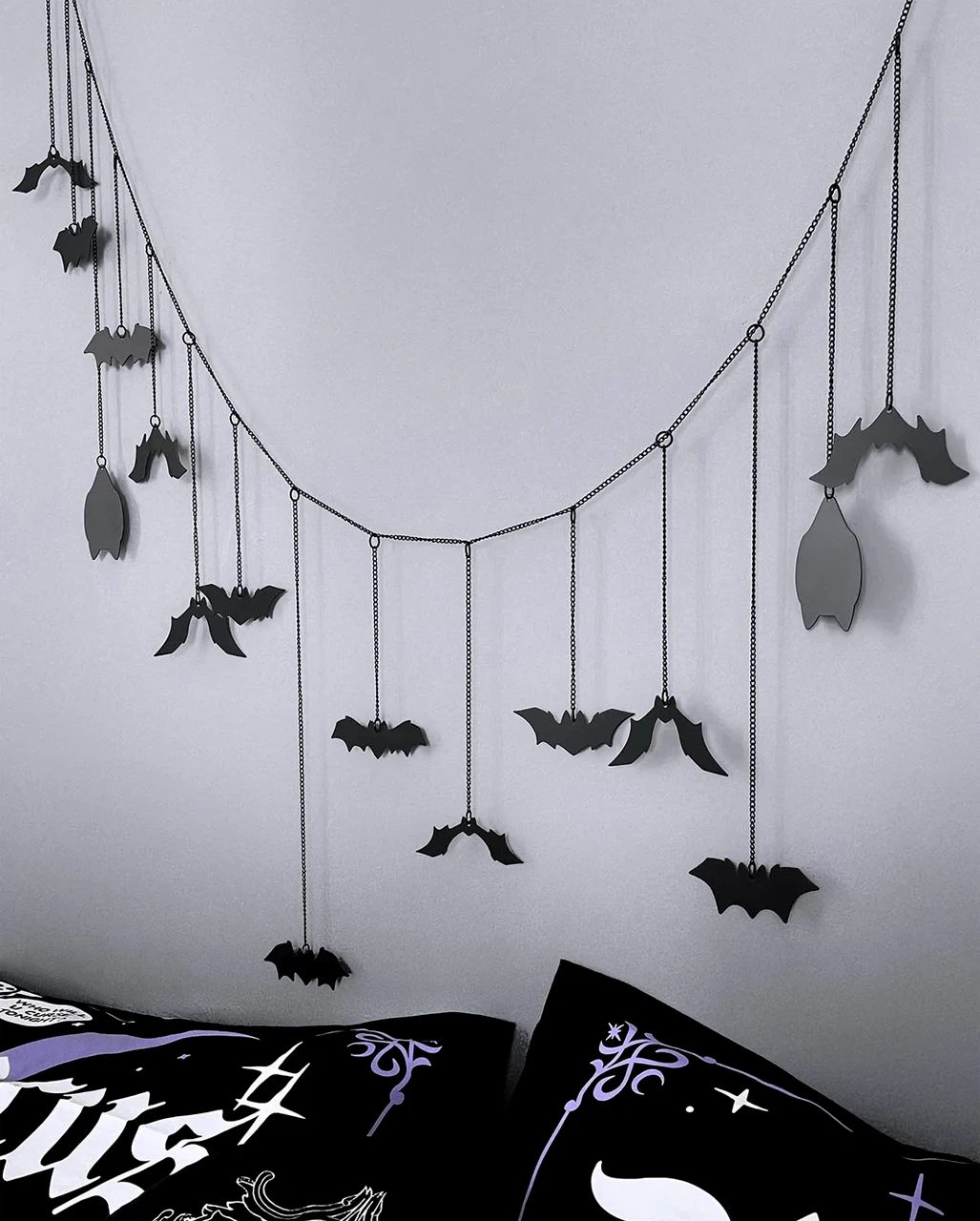 Hol dir die Fledermausschwarm Wanddekoration KILLSTAR mit Fledermaus Motiven und mach nackte Wände zum echten Hingucker. Die einzelnen Fledermäuse hängen an dünnen Kettchen und lassen sich an jeder beliebigen Wand anbringen. Auch als hübsche Gothic Geschenkidee macht sich die KILLSTAR Wanddeko ganz hervorragend.