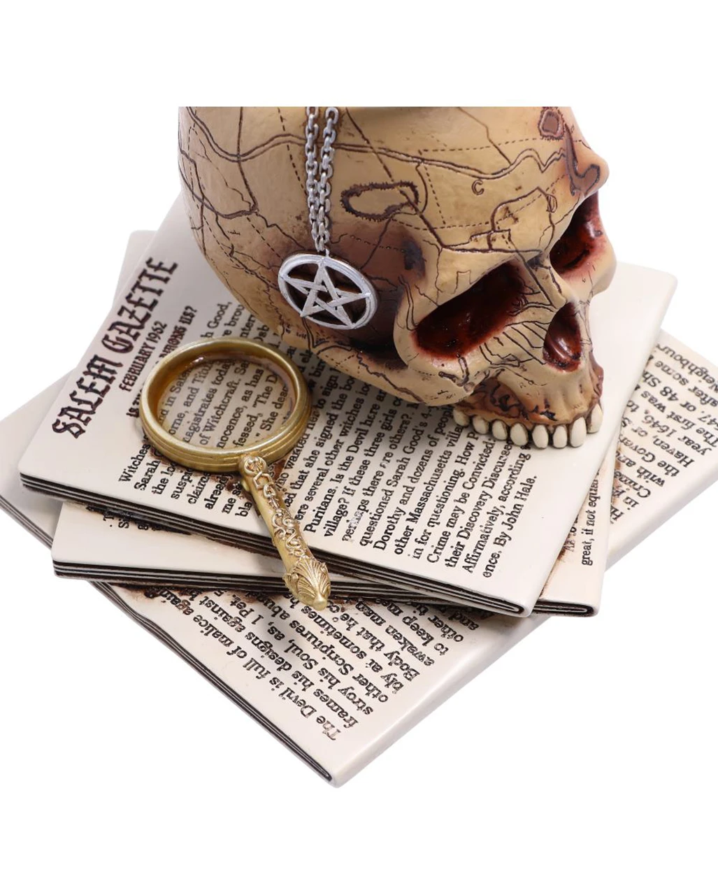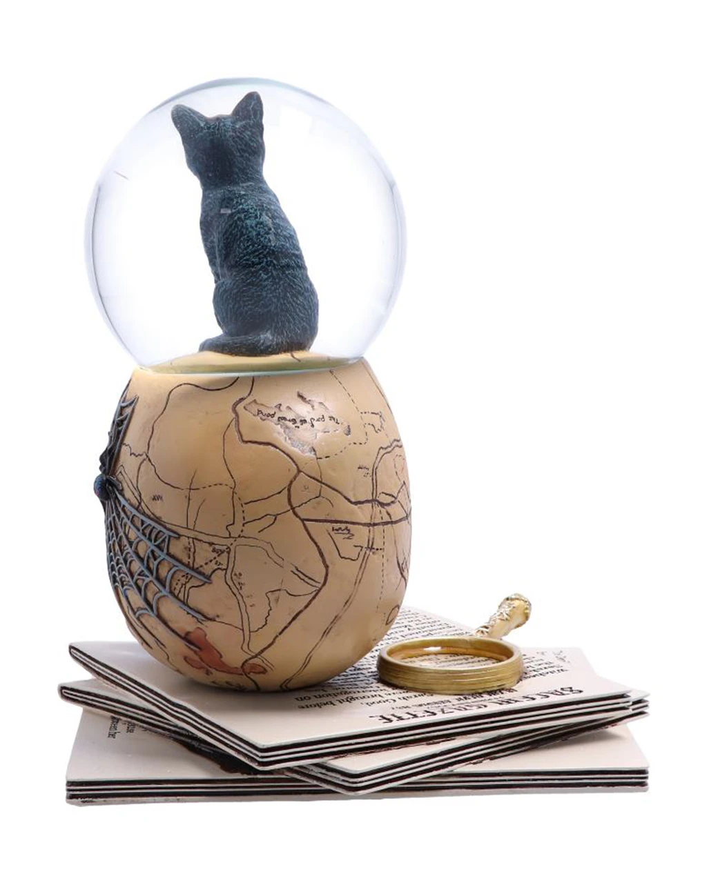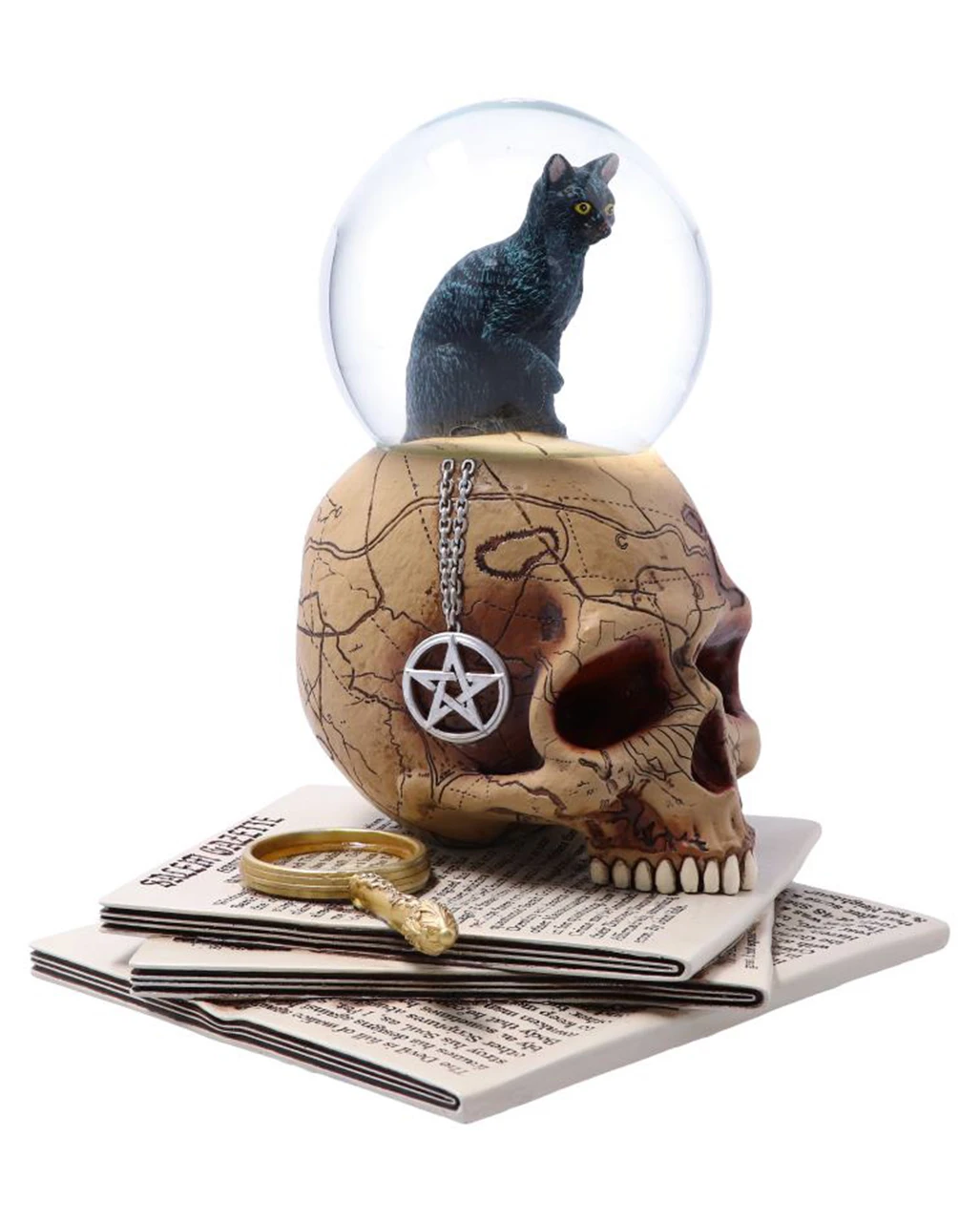 Die beeindruckende „Geister von Salem“ Schneekugel stammt aus den magischen Gedanken der Fantasy-Künstlerin Lisa Parker. Als Verkörperung des wahren Geistes von Salem sitzt eine schwarze Katze auf einem gealterten Hexen Schädel. Die Schnitzerei im Schädel zeigen eine echte Karte von Salem aus der Zeit der grausamen Hexenprozesse, was dieses Stück noch bedeutungsvoller macht, als es zunächst scheint. Unter dem Totenschädel befindet sich ein Stapel alter Zeitungen, in denen die Schrecken der Prozesse geschildert werden.