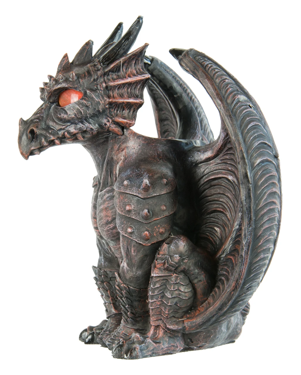 Starr und majestätisch sitzt der edle Drache in Rüstung da, und wacht über sein Reich. Die feuerroten Augen glühen beim Feuerspiel noch eindringlicher. Lass den Gothic Drache mit Teelicht auch auf deinem Tisch oder deinem Fenstersims sitzen und für einen eindrucksvollen Eyecatcher sorgen. Die detailreiche Gothic Drachen Figur ist eine schwarze Fantasy Dekoration mit roten Augen und einem Teelichthalter. Wenn die Kerze brennt, leuchten die Drachenaugen, was vor allem im Dunkeln ein besonderer Effekt ist.
