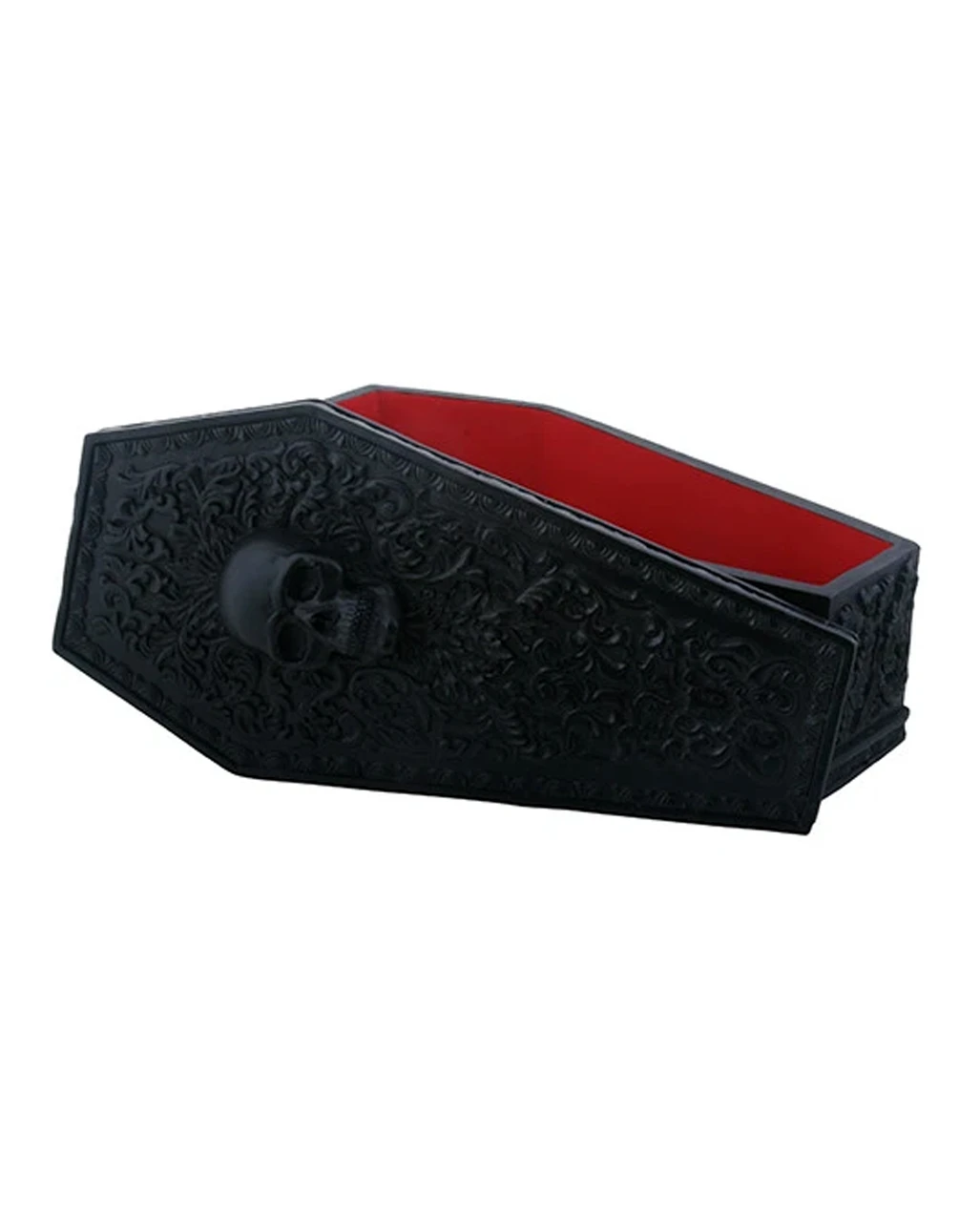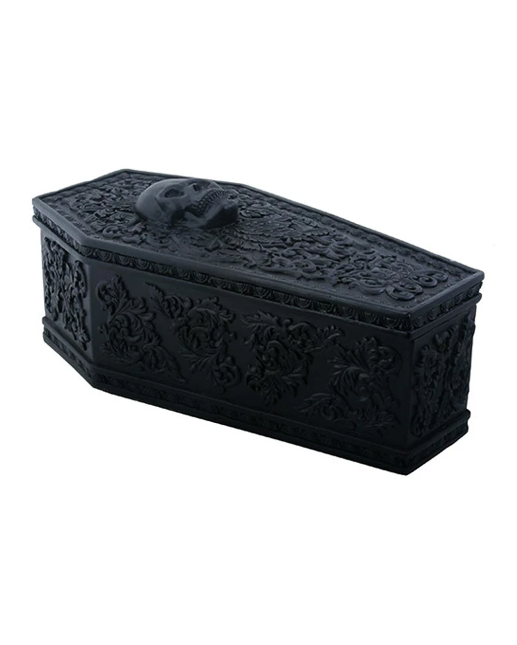 Gothic Wohnaccessoires machen eine Gruft erst zu dem, was sie ist! Mit unserer Gothic Sarg Box als Geschenkidee erhältst du eine morbide anmutende Aufbewahrungsmöglichkeit für kleine Habseligkeiten. Auch als Geschenkidee für Halloween macht sich die kleine schwarze Sarg Box hervorragend!