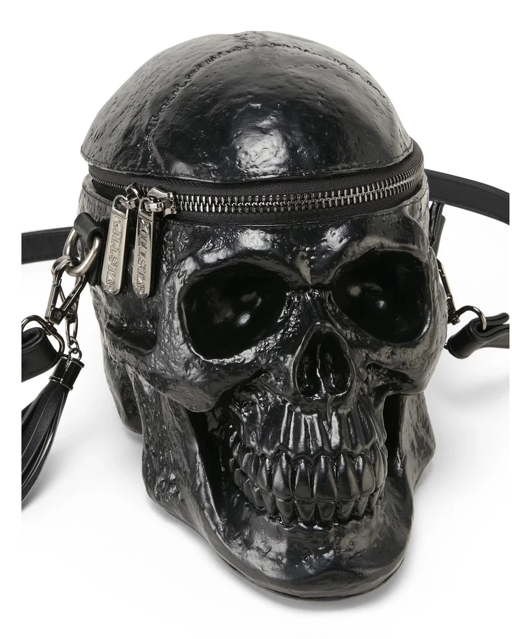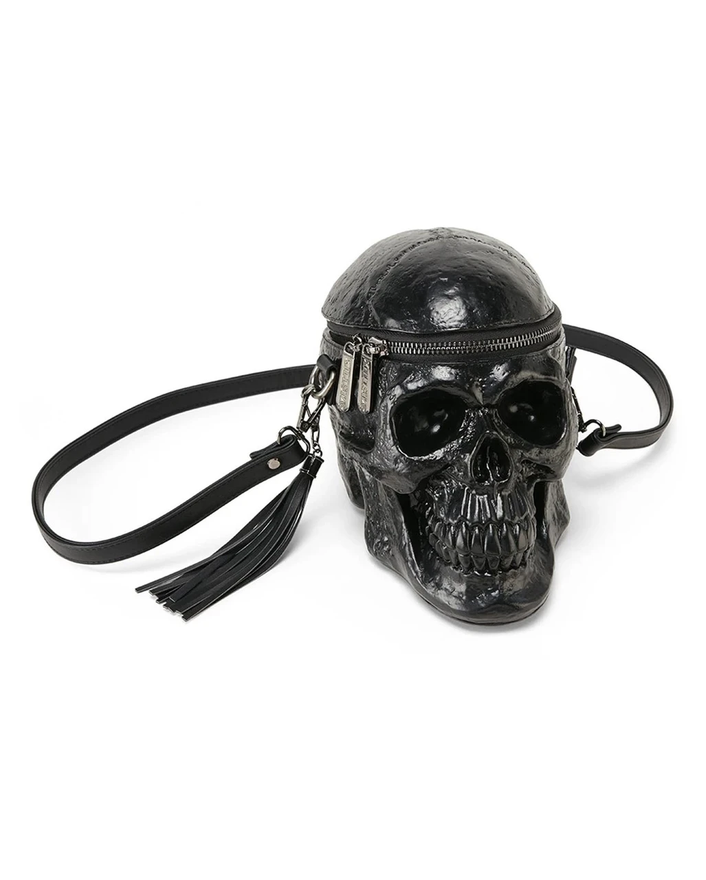 Die Grave Digger Totenschädel Handtasche KILLSTAR ist ein extravaganter Hingucker mit morbidem Touch. Die große Handtasche hat die Form eines menschlichen Schädels und ist mit aufwändigen Details, mit Reißverschluss, langem Schulterriemen und abnehmbarer Quaste genau das richtige Gothic Fashion Highlight für dich. Die Totenkopf Tasche ist aus veganem Kunstleder hergestellt und ein fantastisches Gothic-Modeaccessoire. Natürlich eignet sie sich auch hervorragend als außergewöhnliches Halloween Kostümzubehör.