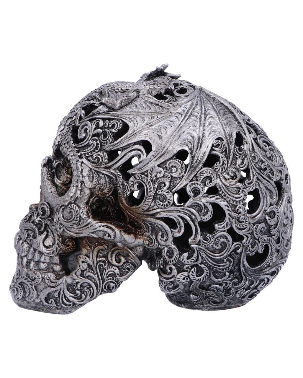 Filigraner Totenkopf in Silber mit floralem Muster & Drache als Signatur