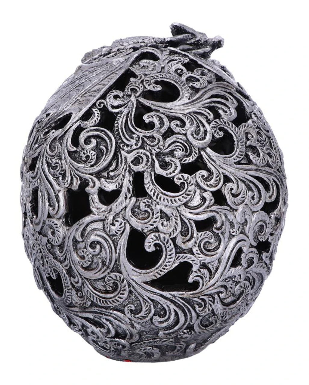 Der beeindruckende Drakos Totenschädel zeigt einen silberfarbenen Totenkopf, ´mit filigraner Gravur. Im kunstvollen Drachen Stil & floralem Muster, zeigt sich der schöne Totenkopf mit liebevoll eingravierten Details.
