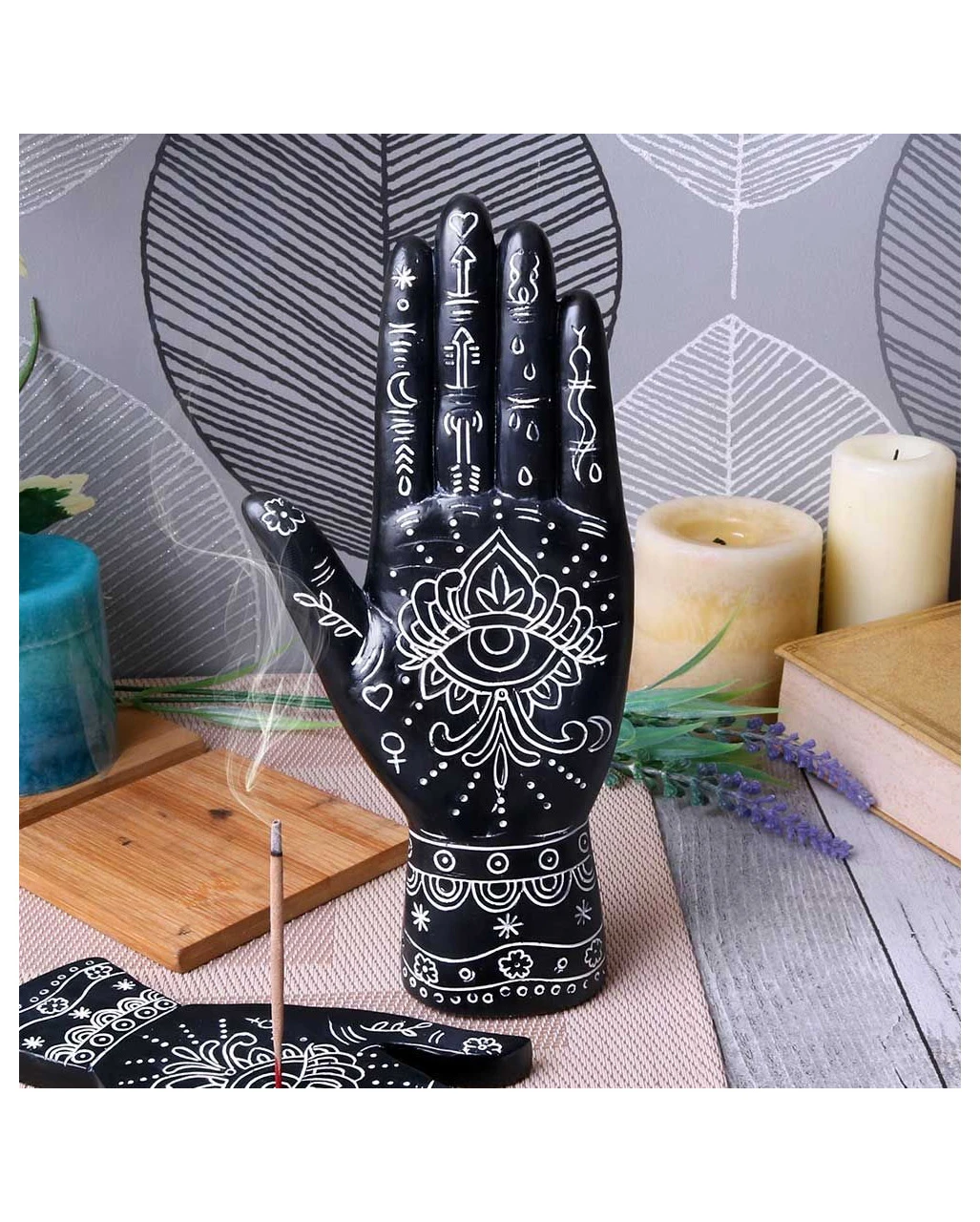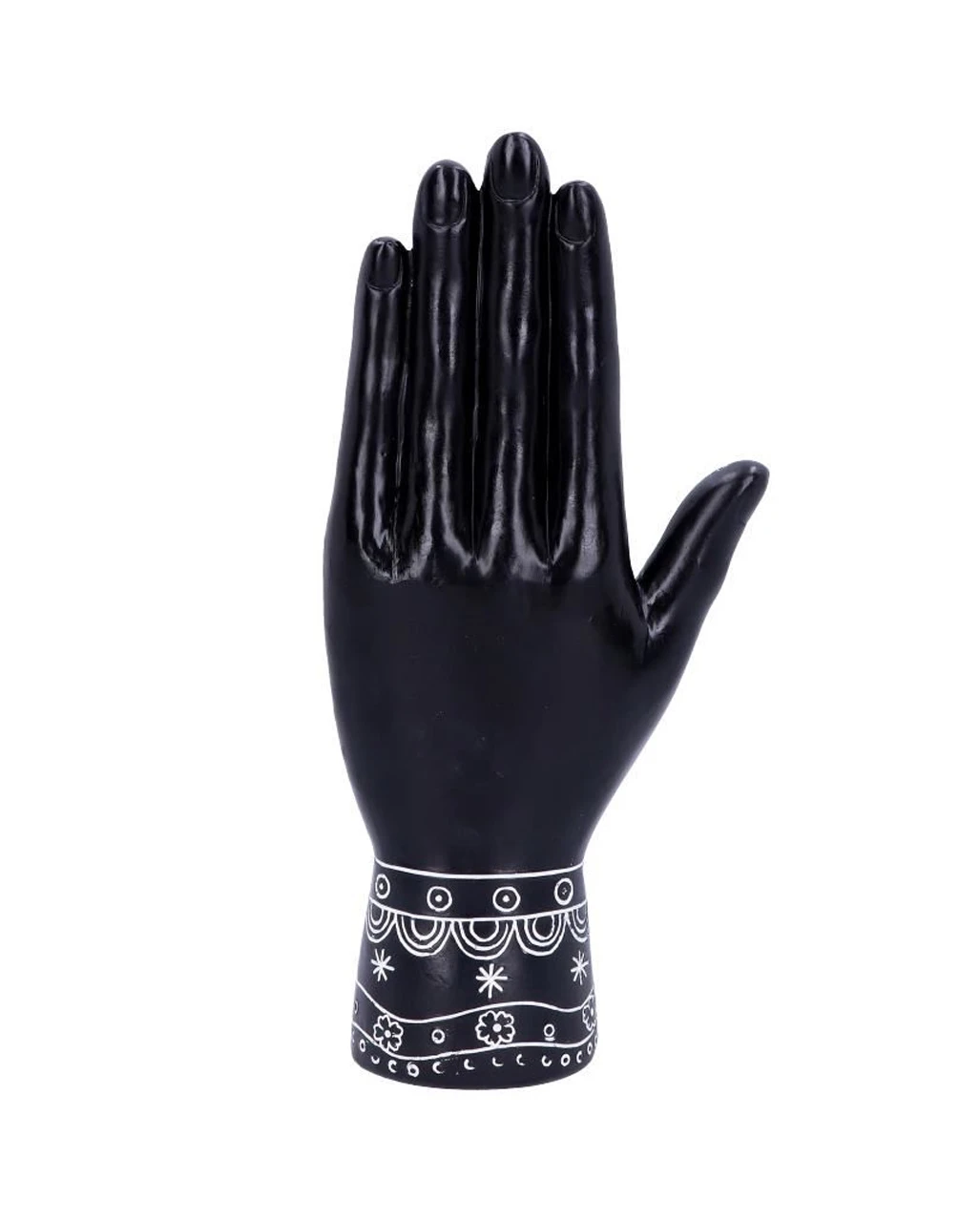 Die „Hand der Fatima“ gilt in einigen Kulturkreisen als Schutzsymbol, das vor bösen Blicken und Dschinns schützt. An dieses kulturelle Schutzsymbol angelehnt, ist unsere einzigartige Hamsa Wahrsage & Handlese Hand. Die Kuststein Deko Hand im Hamsa-Look ist filigran von Hand bemalt und ein echter Hingucker. Als ästhetisches Wohnaccessoire macht sich die Hand ideal auf dem Schreibtisch oder in der Glasvitrine – auch in einer mystisch beleuchteten Zimmerecke kommt die Hamsa Hand super zur Geltung.