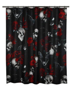 Der Haunted Garden Duschvorhang KILLSTAR macht aus deinem Badezimmer macht aus deinem Bad einen verwunschenen Ort, an dem dunkle Träume zum Leben erwachen. Der Vorhang ist schwarz und zeigt Totenköpfe, blutrote Rosen und Fledermäuse auf seinem Printmuster. Weitere Gothic Deko für das Badezimmer und alle anderen Räume in deiner Gruft findest du hier im Shop.
