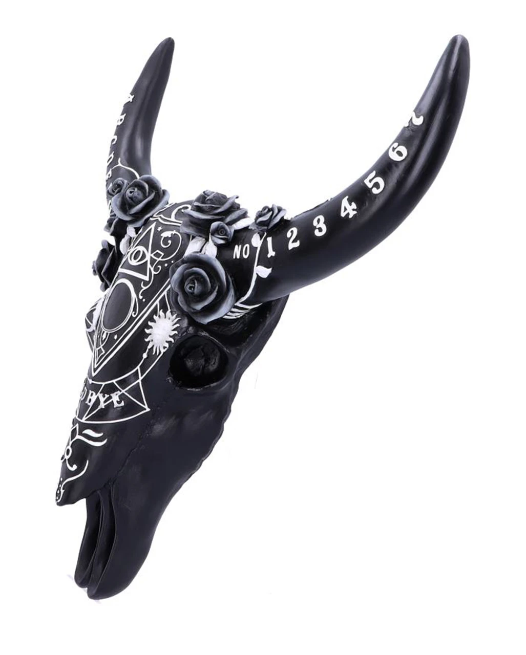 Morbide, schaurige Deko als alternatives Wohnaccessoire für Liebhaber des Makabren und Ungewöhnlichen. Kleine schwarze Rosen befinden sich auf der Rückseite eines Büffelschädels, während ein Teil des Alphabets in Weiß auf seinem linken Horn und die Ziffern 1 bis 7 auf dem rechten zu sehen sind. In der Mitte des Schädels prangt der Umriss einer Planchette mit einem dreieckigen Augenschmuck. Über dem Nasenrücken steht das Wort „Goodbye“ geschrieben, während Mond und Sonne den ständigen Kreislauf des Lebens symbolisieren.