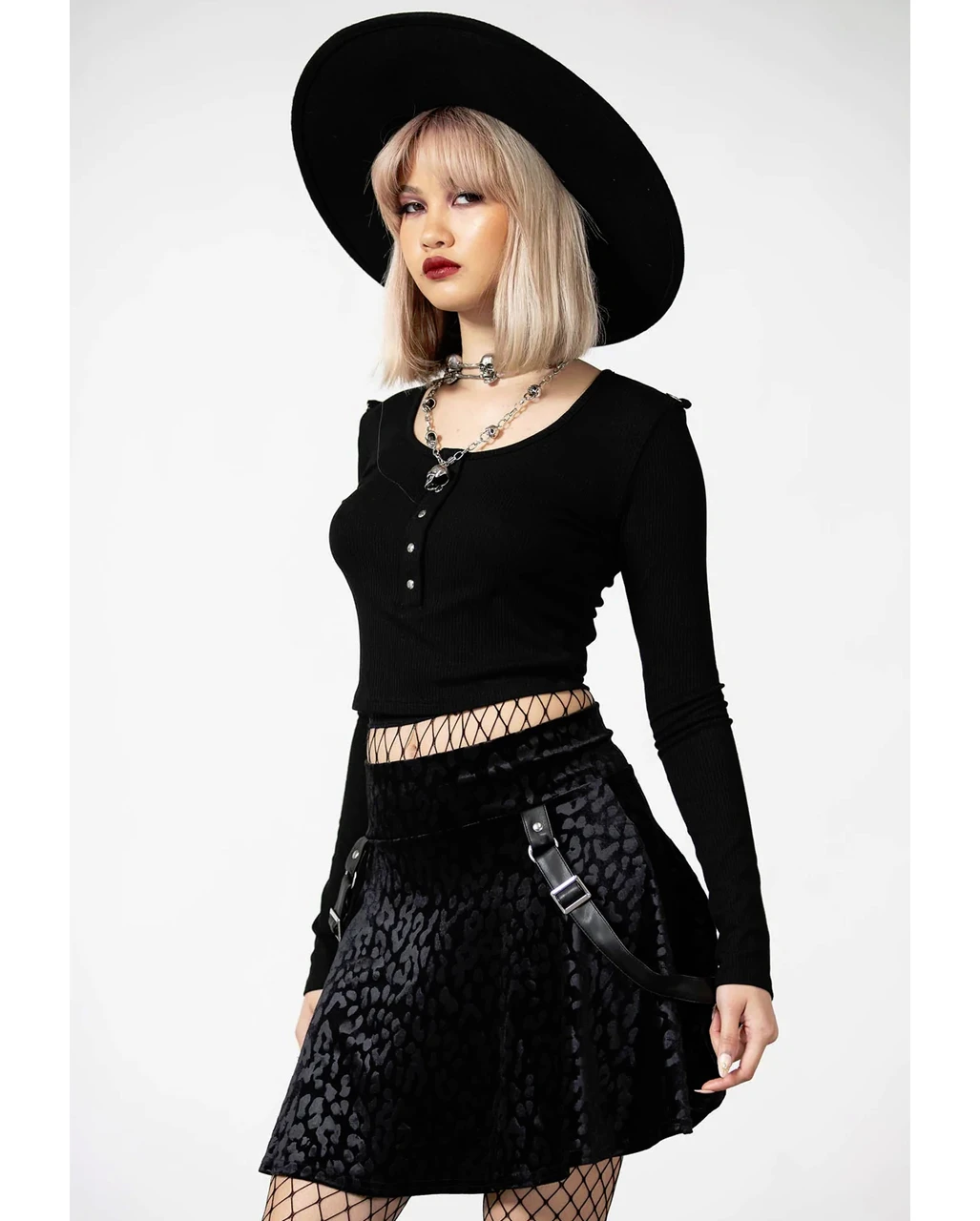 Der Kitty Pride Skater Rock KILLSTAR ist ein schwarzer kurzer Rock mit strategisch platzierten Riemen aus Kunstleder, die du verstellen kannst. Der Gothic Rock ist aus weichem Samtstoff und begeistert mit einem sexy Leoparden Print, einem breiten Bund und coolen Metallbeschlägen. Er ist in den Größen von S bis XL erhältlich. Zu diesem tollen Rock findest du noch viele weitere Gothic Mode Accessoires wie etwa die Gerta Mesh Strümpfe KILLSTAR bei uns im Shop.