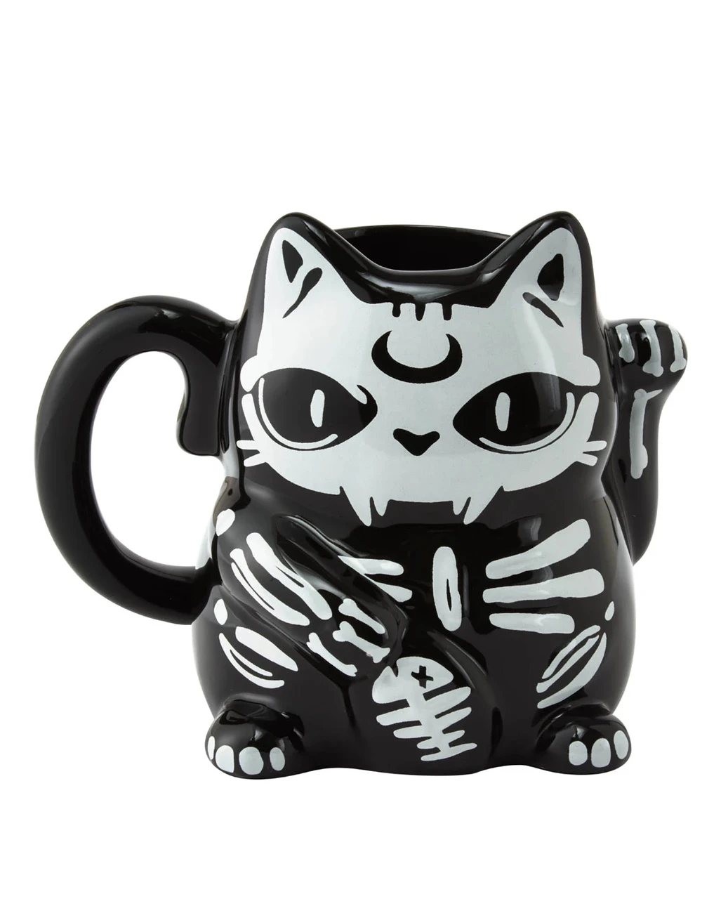 In der japanischen Kultur steht die Winkekatze Maneki-Neko für Glück. Deshalb ist sie auch in fast jedem Souvenirgeschäft zu finden. Da auch du etwas vom Glück abhaben sollst, bekommst du unseren Maneki-Neko Kaffeebecher von KILLSTAR. Hier zeigt sich das Kätzchen als Skelett Print auf einer schwarzen Keramiktasse. Das Trinkgefäß ist ideal, um Kakao, Tee, Kaffee oder sonstige Getränke daraus zu genießen. Sichere dir die Gothic Katzentasse und sorge für einen glücklichen Start in den Tag!
