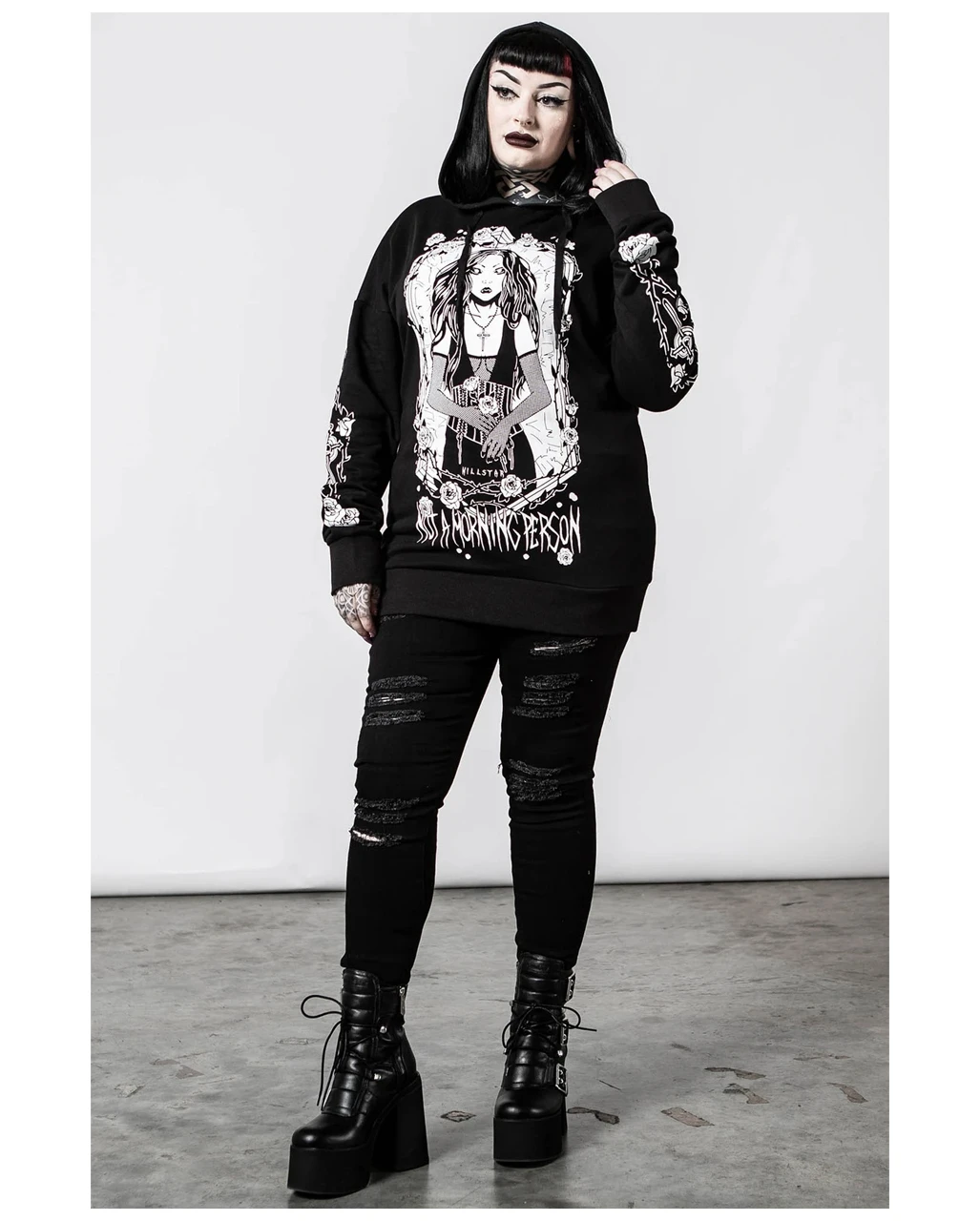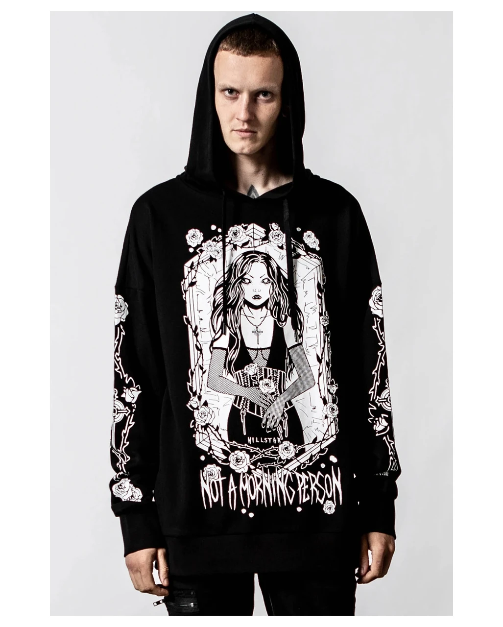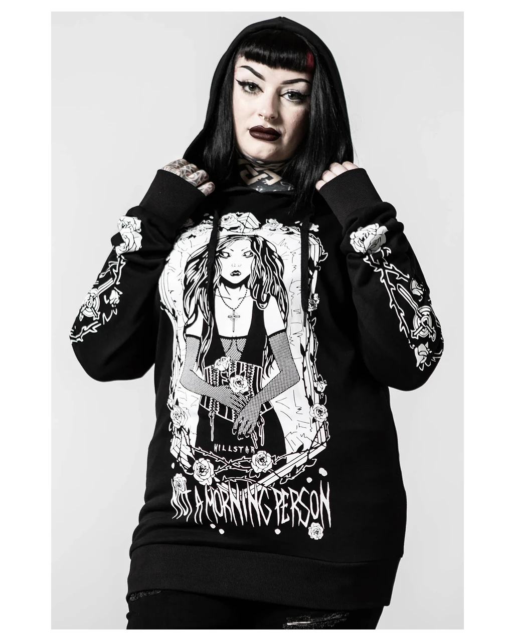 Der Morning Longline Unisex Hoodie KILLSTAR passt perfekt zu deiner düsteren Garderobe. Du magst es individuell und bist keinem Mode-Diktat unterworfen. Der Front Druck einer mysteriösen Frau im Gothic Style wird an dir zum echten Statement. Damit bist zu der Blickfang schlechthin beim nächsten Szene Treff. Denn jeder weiß: Kleidung ist für dich ja nicht nur Mittel zum Zweck. Du drückst damit aus, was du fühlst und zeigst, wer du bist!