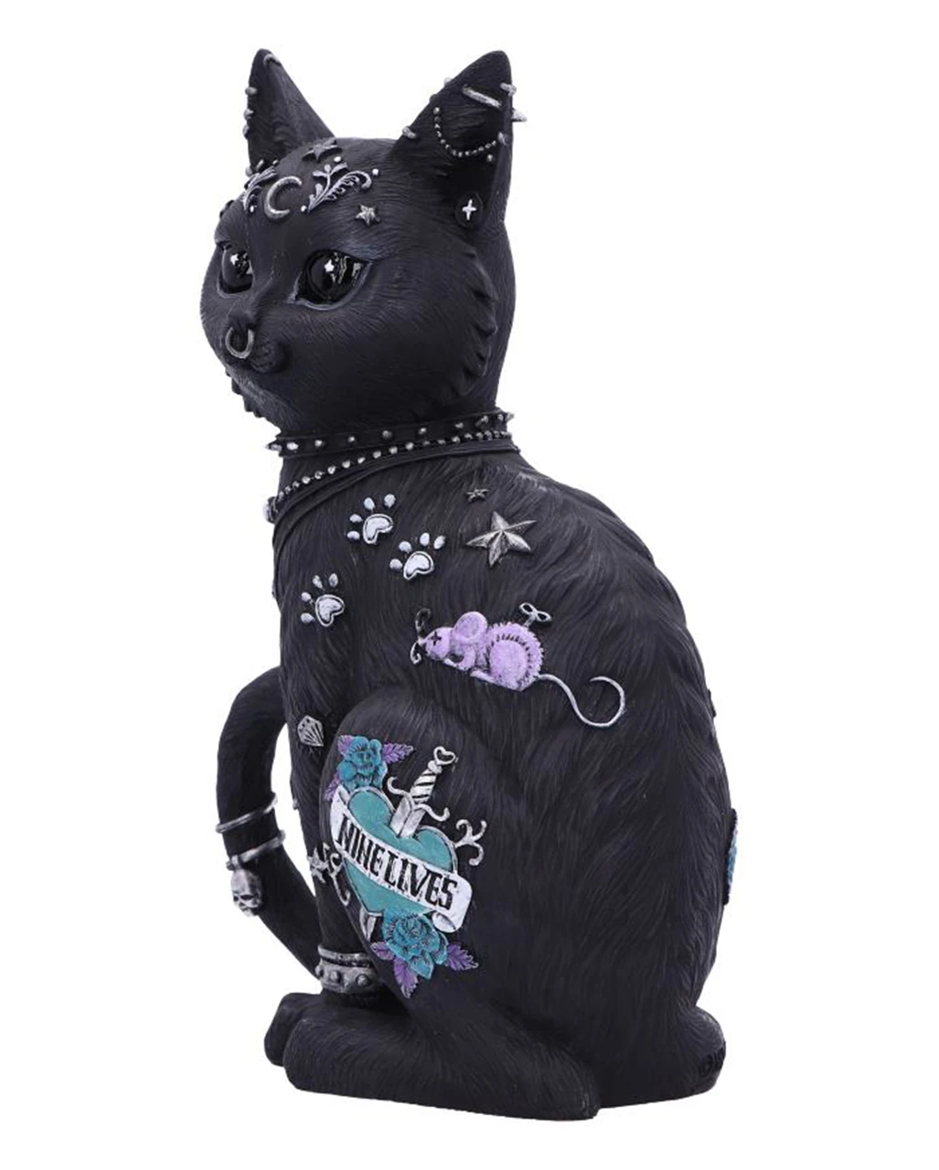 Vielleicht schenkt dir diese magische Hexenkatze eines ihrer neun Leben. Die kunstvoll gestaltete Nine Lives Kult Cutie Dekofigur zeigt ein schwarzes Kätzchen, das mit okkulten Symbolen und bunten Motiven im Tattoo Style designt ist. Ihre Ohren sind mit Piercings geschmückt, während sie um den hals ein Totenkopf Halsband trägt. Das Hauptmerkmal ist das Herz und der Dolch an ihrem Bein, auf dem die Worte „Nine Lives“ stehen. Auch ihren schwarzen Augen mit unschuldigem Katzenblick kannst du nicht widerstehen.
