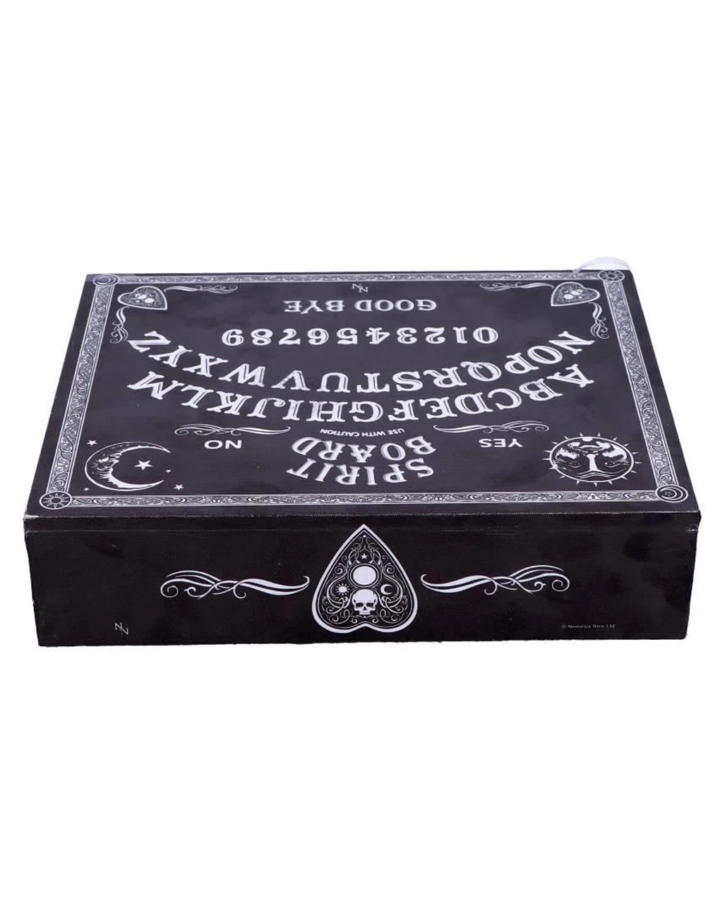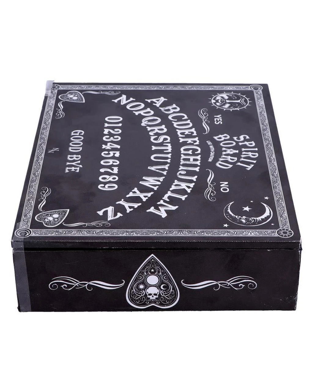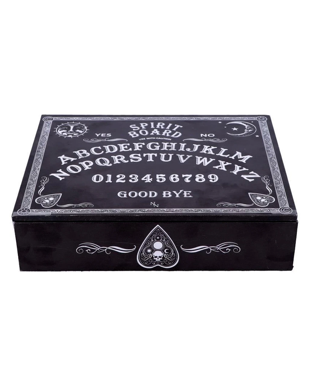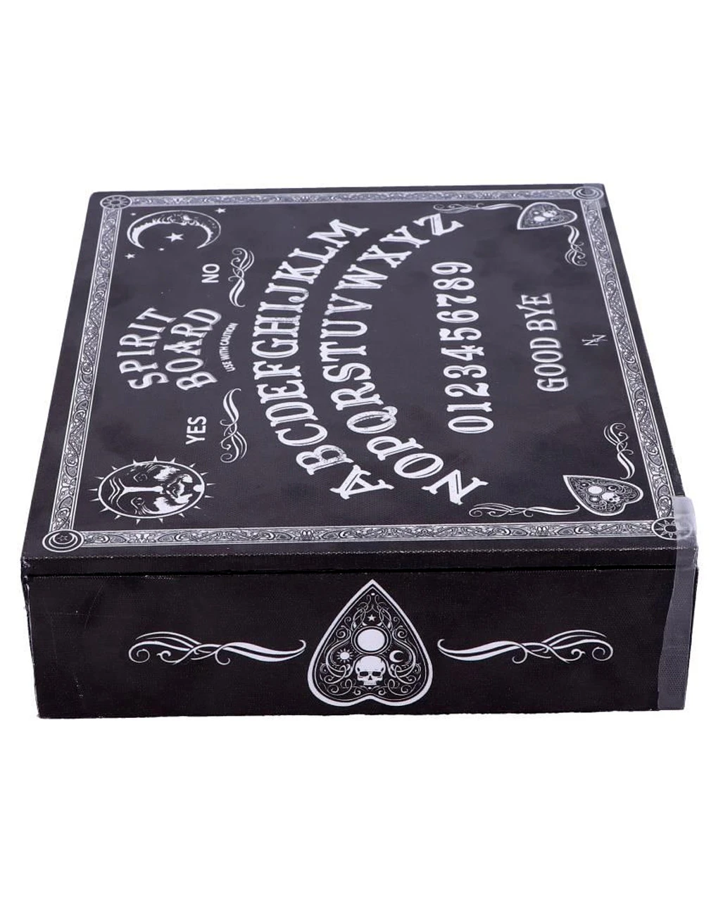 Das Hexenbrett, auch Ouija-Brett genannt, ist eines der mächtigsten okkulten Werkzeuge, die es gibt. Die Kanten unserer Ouija Brett Schmuckschatulle sind mit aufwendigen weißen Barockmustern und verzierten Planchetten eingefasst. Die antik aussehende Schmuckbox hat das Alphabet in einem Bogen auf der Oberseite aufgemalt. Seitlich des Schriftzugs von „Goodbye“ zeigen zwei verschnörkelte Planchetten zur Mitte hin, als ob sie bereit wären, sich zu bewegen. Das Hexenbrett Motiv des okkulten Schmuckkästchens beinhaltet auch die Zahlen 0 bis 9 und die Worte YES und NO sowie eine Warnung, die Box mit Vorsicht zu verwenden – die Macht der Geisterwelt ist nichts, was man auf die leichte Schulter nehmen sollte.