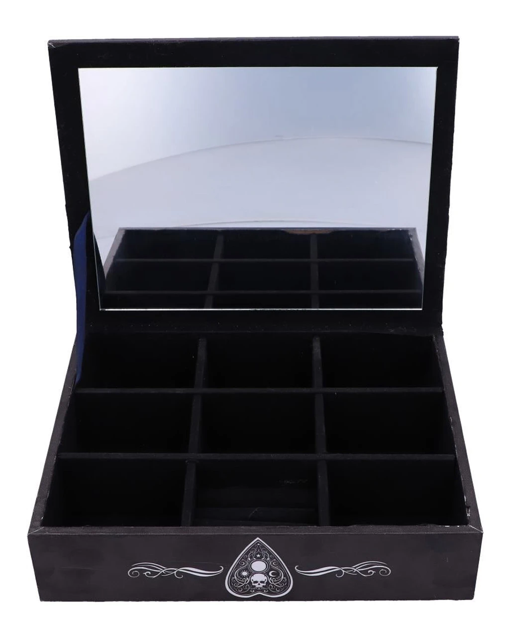 Unsere Ouija Brett Schmuckschatulle ist 25 cm groß und eine okkult anmutende Aufbewahrungsbox für deinen Schmuck. In der Gothic Schmuckschatulle finden Halsketten, Ringe und Armreifen ihren Platz. Aber auch andere Habseligkeiten kannst du hier sicher verstauen. Mit ihren neun Fächern bietet die Hexenbrett Schmuckdose viel Stauraum. Ein in die Innenseite eingelassener Spiegel ist ebenfalls mit dabei. Lass dir auch unsere einzigartige Schatzdose Drache nicht entgehen.