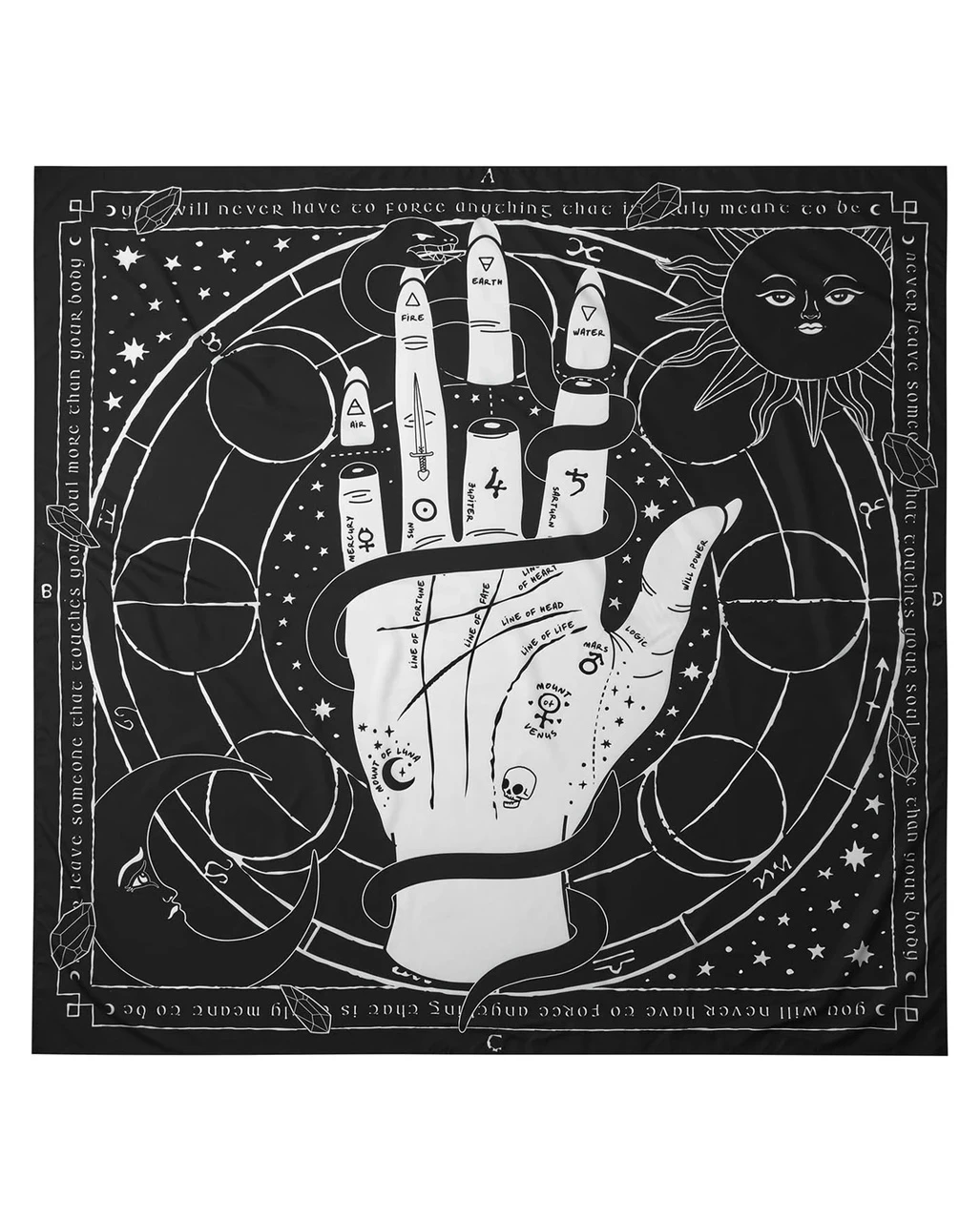 Der KILLSTAR Palmistry Wandbehang ist die ideale Deko für alle, die wissen, dass es mehr gibt zwischen Himmel und Erde. Die Welt ist magisch und mystisch. Nicht alles wird gesehen. So sind die Wahrsagekunst und die hohe Kunst der Astrologie dafür bestimmt, dem, der sie beherrscht, Weisheit zu verleihen. Du magst diese geheimnisvolle Welt und zeigst das mit diesem wunderbaren Wandbehang. Auf dekorativem Großdruck werden Handlese Linien und Sternzeichen gezeigt. Damit verleihst du deiner Wohnung eine mystische Atmopshäre.