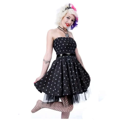 Das schwarze Petticoat Kleid ist mit weißen Pünktchen, sowie weißen Totenköpfen bedruckt und verleiht dem Outfit einen jungendlichen Look. Das trägerlose Punk Kleidbesteht aus einem gerafften Stretchoberteil, das an der Hüfte mit einem hübschen, schwarzen Satinband als Gürtel die Hüfte betont. Der Unterrock mit schwarzem Tüll am Saum im Petticoat Stil, verleiht dem Polka Dot Kleid tolles Volumen. Dazu kannst du die Strumpfhose mit schwarzen Streifen und den Minihut im Gothic Style schwarz-weiß kombinieren und verpasst deinem Rockabilly Outfit den letzten Schliff.