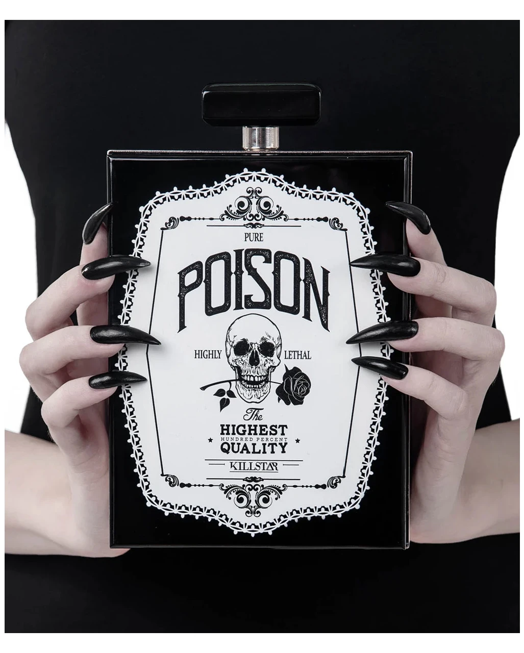 Was für ein morbider Hingucker! Die hochwertig verarbeitete Pure Poison Clutch Handtasche KILLSTAR ist das i-Tüpfelchen deines Gothic Hexen Looks. Die Tasche sieht aus wie ein überdimensionaler Giftflakon. Was da wohl drin sein mag? Das bleibt natürlich dein Geheimnis. Was dagegen jeder sofort sehen kann: Mit dem Gitftflaschen-Verschluss und dem verstellbaren Riemen ist diese Tasche das ideale GothicMode Accessoire. Schnapp sie dir!