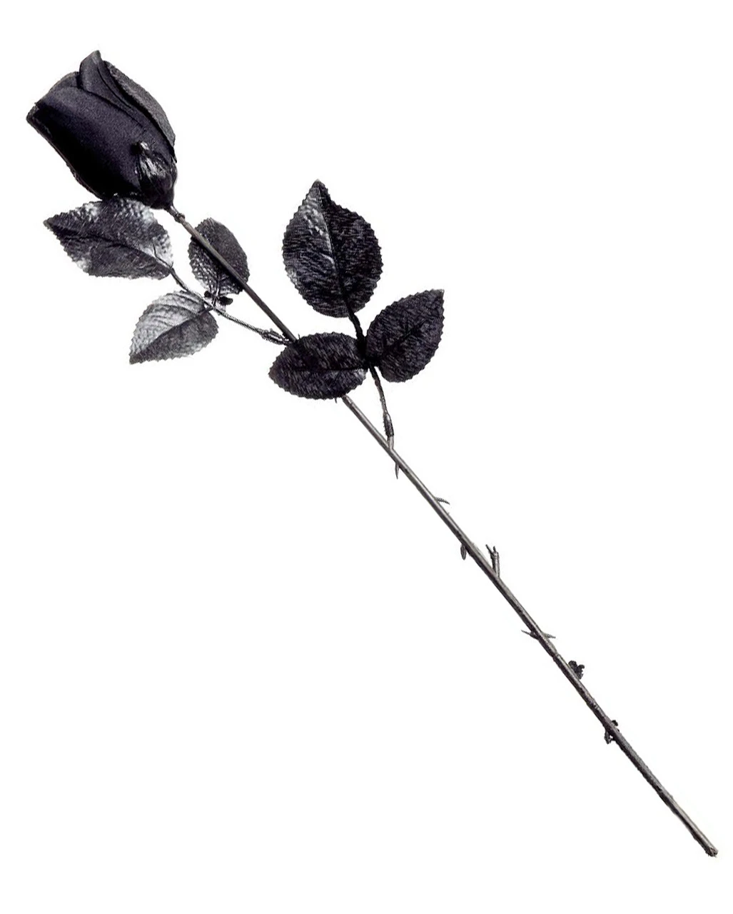 Kurzstielige schwarze Rose als morbides Kostümzubehör oder Halloween Dekoration. Der schwarze Stiel der Seidenrose ist mit schwarzen Blättern verziert. Die Länge der schwarzen kurzstieligen Rose beträgt insgesamt ca. 43cm.