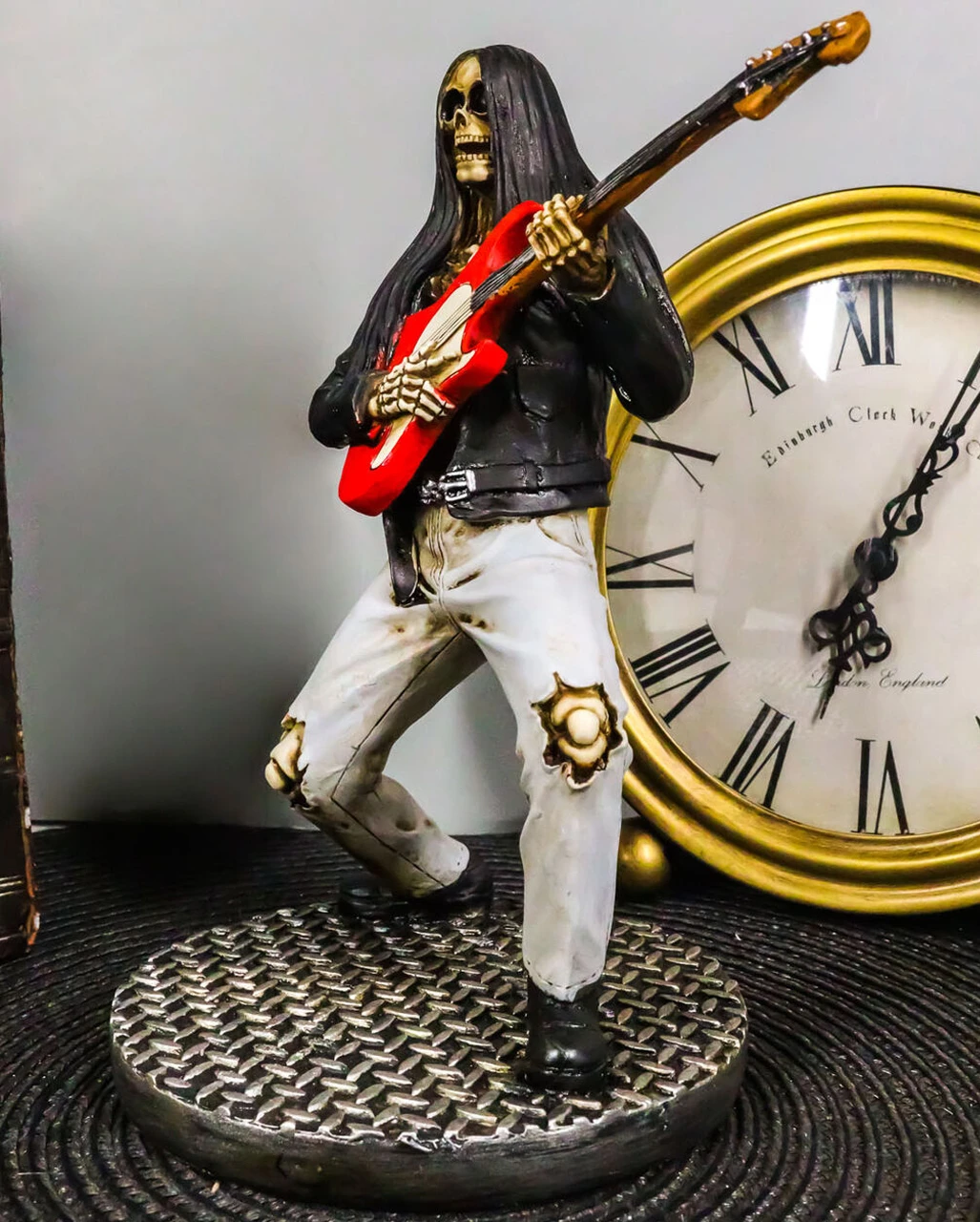 Gitarre spielendes Gerippe aus Kunststein als genialer Geschenkartikel für Rock Fans