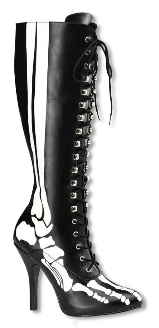 Mit unserem Skelett Stiefel fällst du garantiert auf, denn die High Heels sind ein absoluter Blickfang und ein ganz besonderes Paar Stiefel. Neben dem 10 cm hohen Absatz und der langen Schnürung sticht vor allem das Printmotiv ins Auge, denn die weißen Knochen auf schwarzem Hintergrund können gar nicht übersehen werden. Oben am Schaft beginnt er mit den Unterschenkel Knochen, die dann in den Fersenknochen münden und weiter bis zum Fußskelett gehen. Zusammen mit unserem Skelett Hoodie mit Totenkopfmaske oder dem Skelettkleid Kostüm SM wirken die Skelett Stiefel besonders gruselig und unterstreichen dein Halloween Outfit zusätzlich. Doch auch zu normaler Gothic Kleidung passen diese außergewöhnlichen Stiefel sehr gut, da Knochenmotive aus der schwarzen Szene kaum noch wegzudenken sind.
