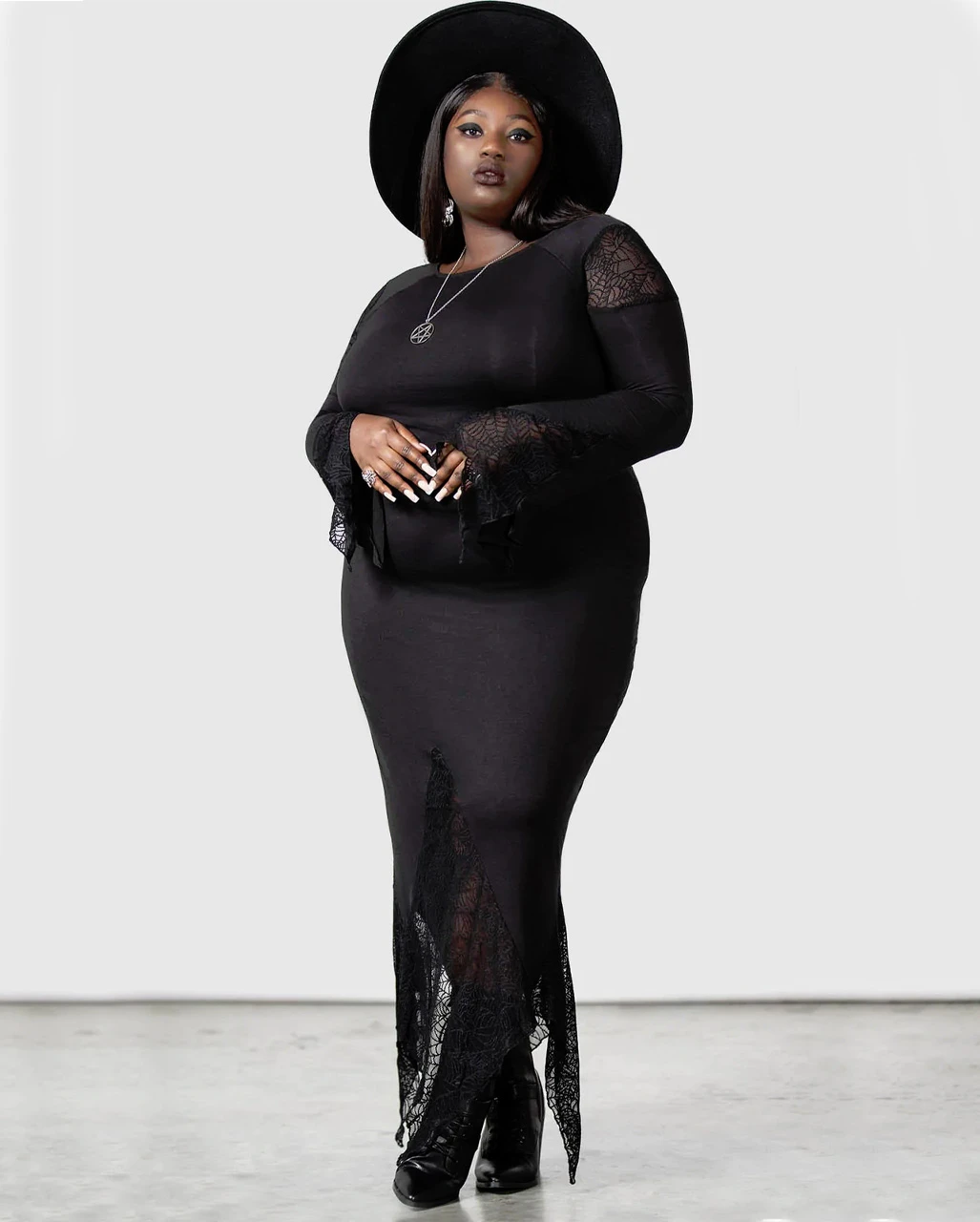 Das Spiderella Kleid KILLSTAR ist ein schwarzes langes Abendkleid mit weiten Ärmeln, die das besondere Spinnennetz Muster der Spitze eindrucksvoll zur Geltung bringen. Auch an den Schultern und am Saum des figurbetonten Damenkleids bilden Spinnennetze einen echten Hingucker. Das elegante Gothic Kleid ist in den Größen von XS bis 4XL Größe erhältlich. Neben dem Kleid findest du noch viele weitere Gothic Mode Accessoire wie etwa die Netzstrumpfhose schwarz bei uns im Shop.