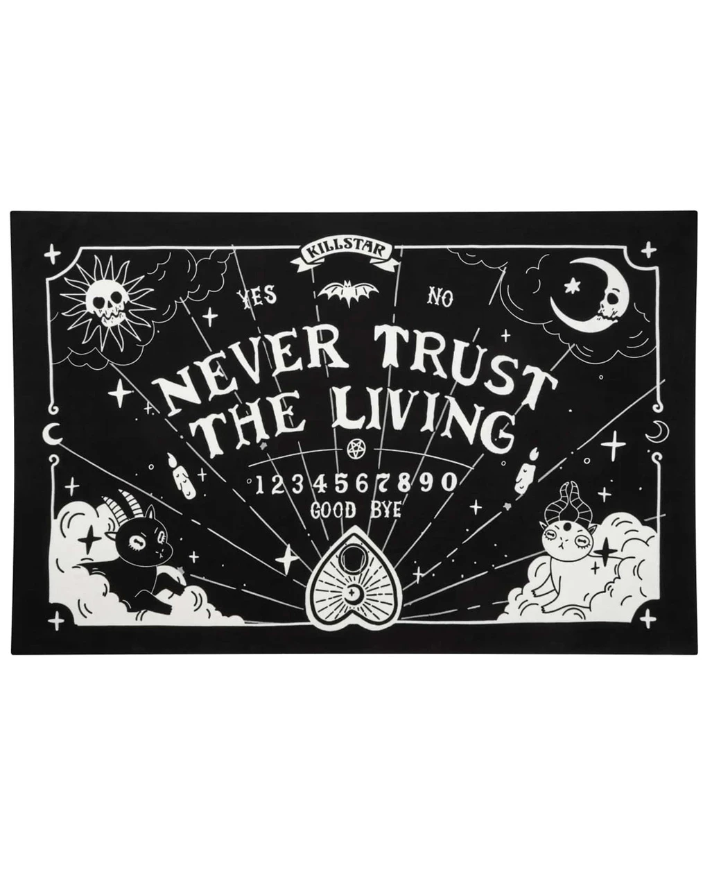 Das Spirit Board Bade & Strandtuch KILLSTAR ist ein optisches Fest für Fans okkulter Deko Accessoires. Zum einen sehen wir auf dem weichen Badetuch die typischen Zeichen eines Ouija Bretts. Dazu sehen wir am unteren Rand des großen Handtuchs eine Planchette und eine Vielzahl an mystischen Motiven wie die Sonne und der Mond, die hier mit Totenkopf-Gesichtern für einen besonderen Eyecatcher sorgen. Als weiteres Highlight in den Ecken sehen wir einen kleinen Ziegenbock und ein Kätzchen mit Hörnern. Weitere liebevolle Hexenbrett Deko Accessoires wie das Hexenbrett Brillenetui für deine Sonnenbrille findet ihr hier im Shop.
