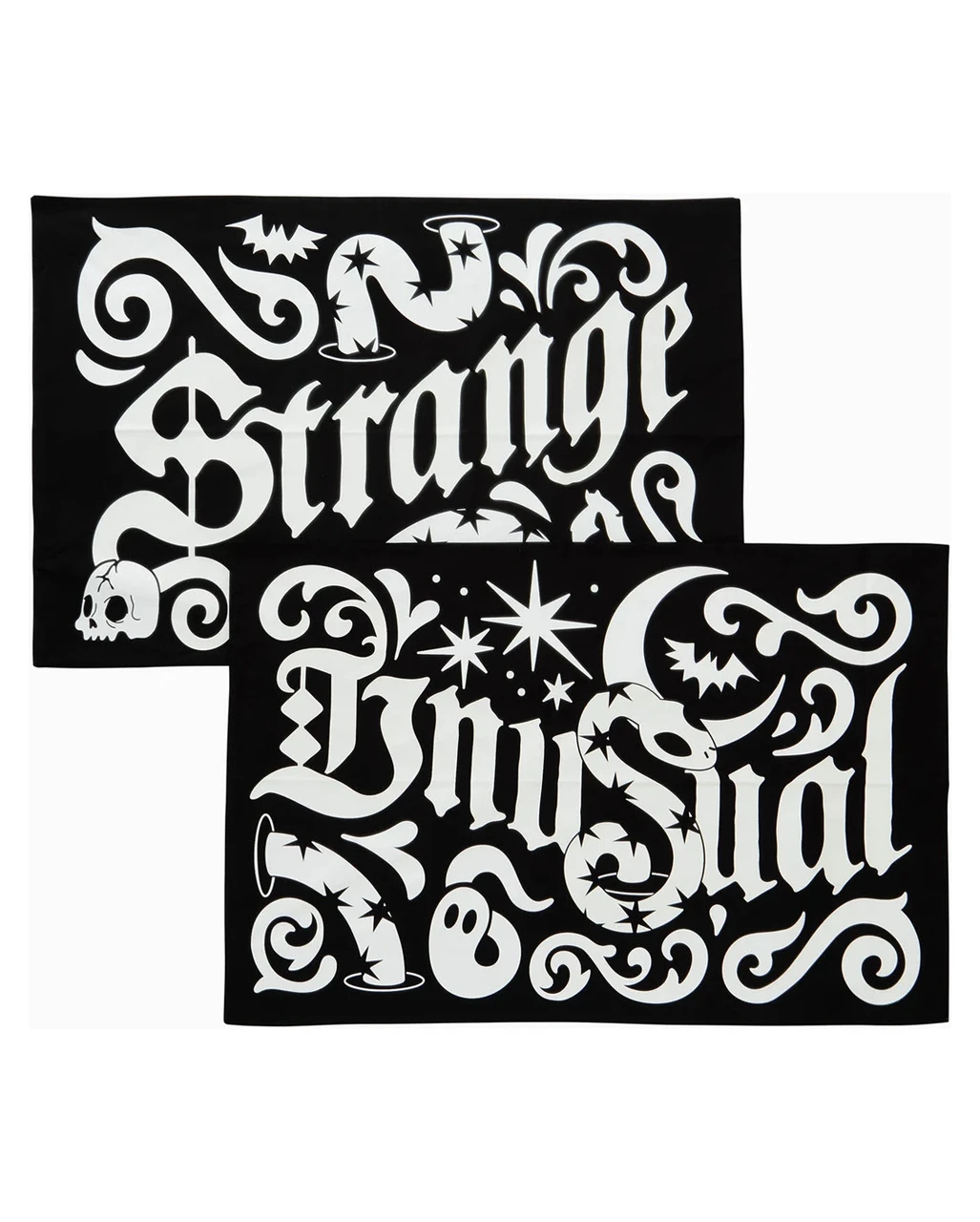 Du erhältst zwei KILLSTAR Strange Kissenbezüge als KILLSTAR Wohndeko. Der Kontrast-Print zeigt die Schriftzüge „Strange“ und „Unusual“. Die schwarzweißen KILLSTAR Kissenbezüge bestehen aus weichem Material und sind je 74 x 49 cm groß. Wasche die Gothic Kissenbezüge von KILLSTAR bitte nur kalt und im Schonwaschgang. Entdecke auch den wunderschönen Runder Stellar Teppich KILLSTAR und das Octagon Hexenbrett Glow in the Dark