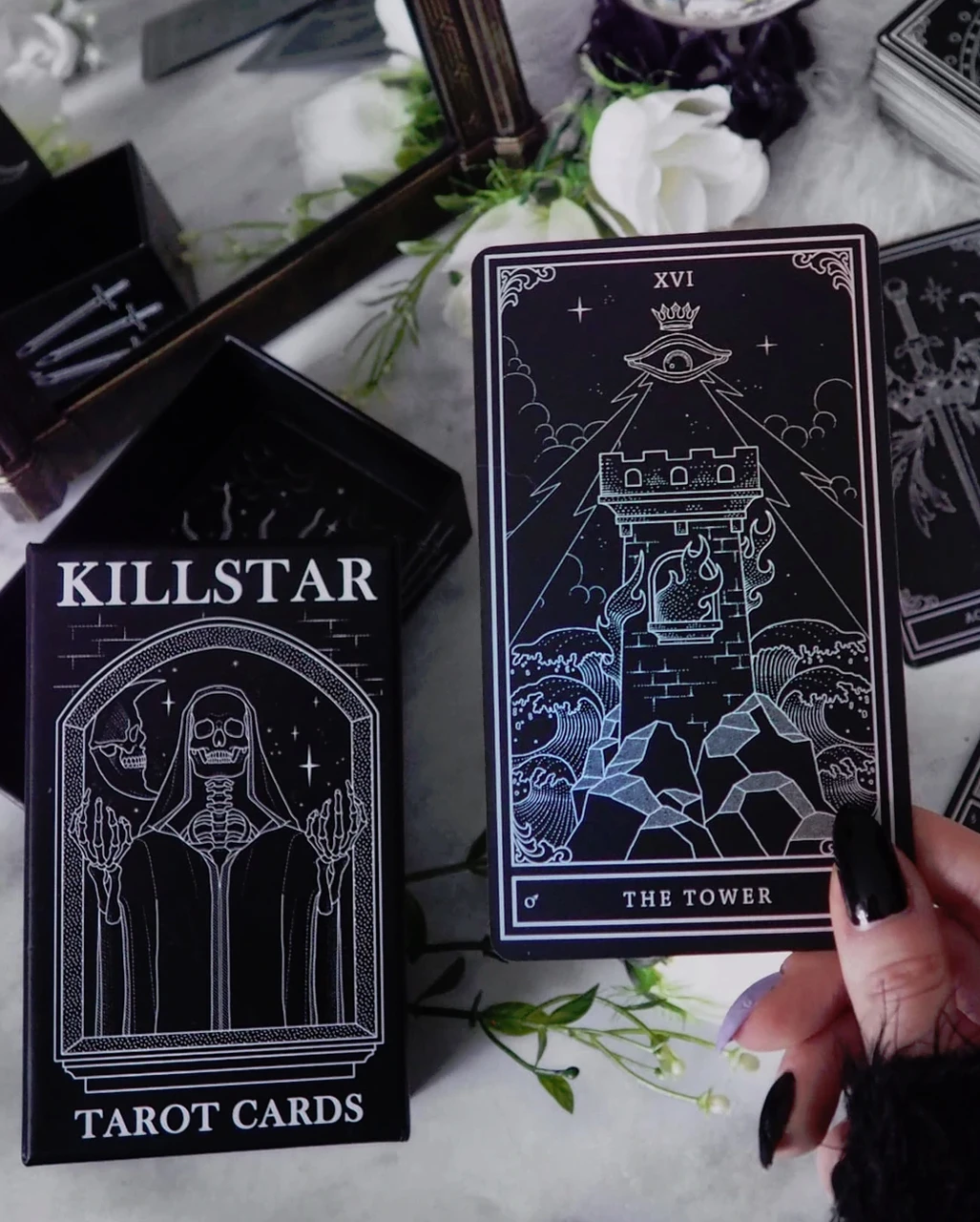 Die Tarot Karten KILLSTAR sind natürlich auch ein MUSS im Haus jeder dunklen Seele. Das individuelle Design der schwarz-weißen Karten macht deine Deko zu etwas ganz Besonderem. Die okkulten Motive werden durch den holografischen Druck und das außergewöhnliche Branding zum Hingucker. Die Gothic Tarot Karten sind perfekt für die tägliche Lektüre oder eben als außergewöhnliche Halloween Dekoration!