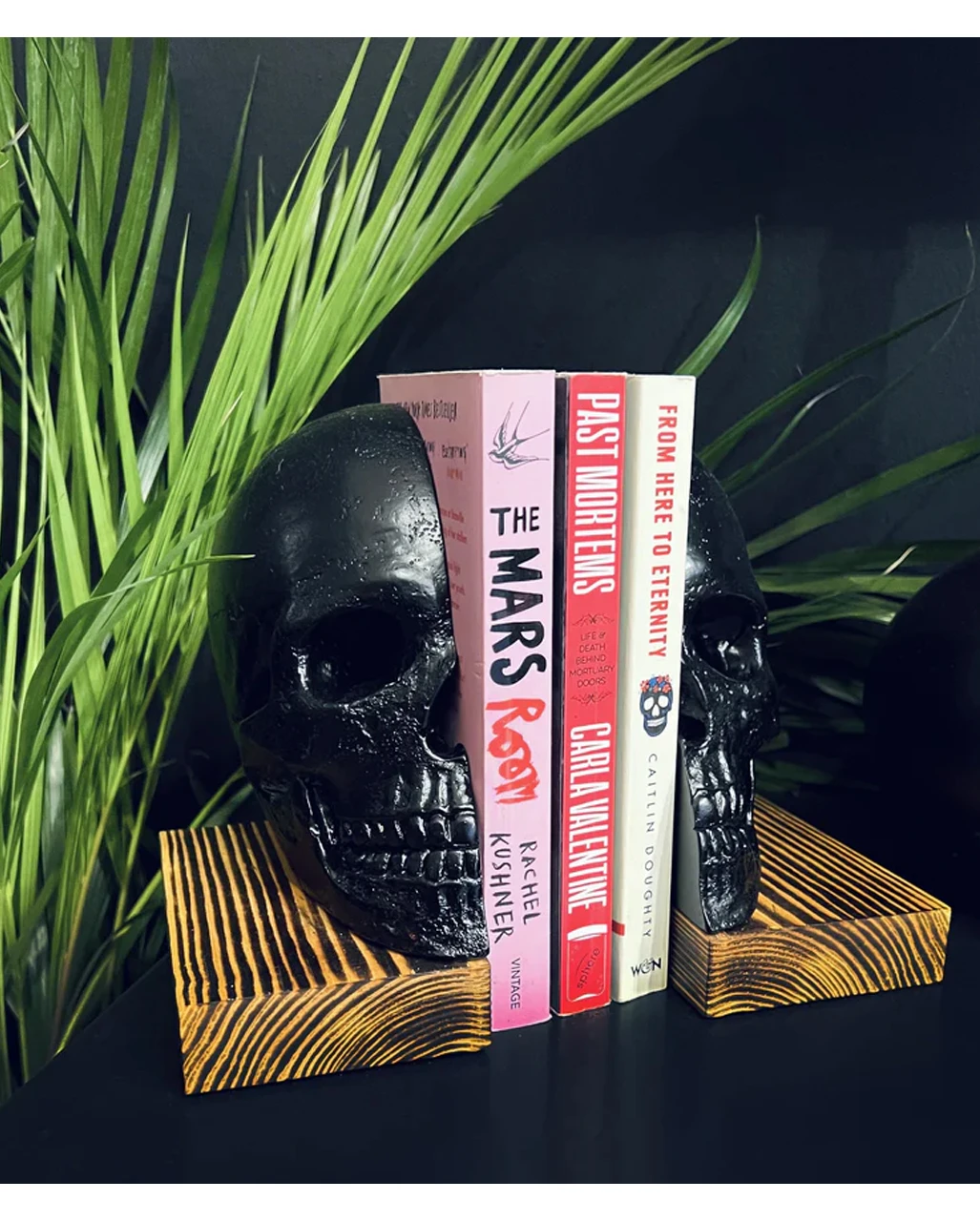 Du bist eine echte Leseratte und liebst es gerne düster? Du stehst auf abgefahrene Totenschädel Deko? Dann sind unsere Totenkopf Buchstützen mit Holzsockel genau das Richtige für dich. Unsere von Hand gefertigten Totenkopf-Buchstützen sorgen dafür, dass deine Magazine und Bücher im Regal nicht umfallen und du Ordnung behältst. So hast du deine Horror-Romane stets griffbereit. Als Geschenkidee und Gothic Deko fürs Bücherregal ein echtes Muss.