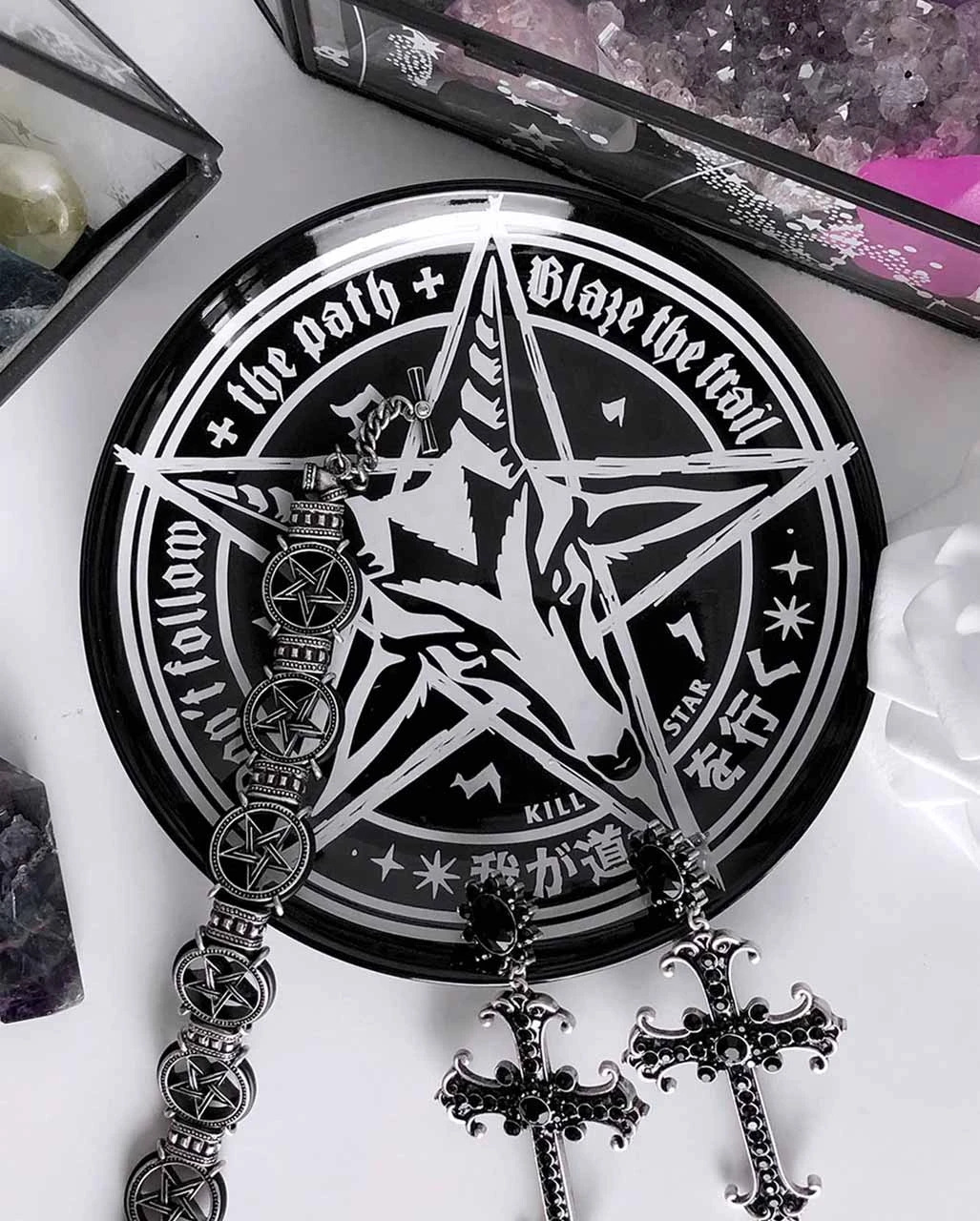 Die Trailblazer Schmuck & Zubehör Schale KILLSTAR ist ein fantastischer Geschenkartikel für Gothic Fans. Was für ein okkulter Blickfang auf deinem Tisch: Baphomet ist ist Gut und Böse zugleich, sein Antlitz inmitten des Pentagramms ist ein besonderes Zeichen seiner mystischen Allgegenwärtigkeit. Unsere okkulte Deko Schale ist ideal, um dein Interesse an okkulten Ritualen mit einem weiteren Stück extravaganter Gothic Deko zu demonstrieren. Die Schale bietet darüber hinaus Gelegenheit, Krimskrams oder deinen Lieblingsschmuck stilsicher zusammen zu halten.