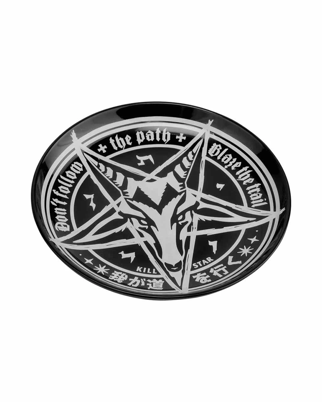 Unsere Trailblazer Schmuck & Zubehör Schale KILLSTAR unterscheidet sich von herkömmlichen Schmuck und Kramschalen durch ihren okkulten Look. Die Gothic Deko ist etwa 14,5 cm x 14,5 cm groß und besitzt eine schwarze Grundierung. Das Motiv dieser Gothic Schmuckschale zeigt Baphomet, halb Ziegenbock, halb Mensch, ein Wesen aus der mystischen Welt, das seit vielen Generationen verehrt oder auch gefürchtet wird. Sein Antlitz wurde in weißen Konturen, inmitten der Darstellung eines Pentagramms auf die Keramik gebannt. Weitere Gothic Wohnaccessoires und Geschenkartikel wie die Schwarze Kerze im Baphomet Glas KILLSTAR findet ihr hier im Shop.
