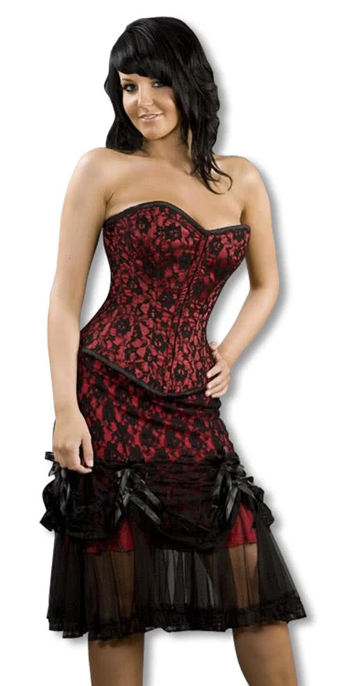 Der Tüllrock mit Spitze ist ein superschöner knielanger Gothic Rock, der durch das knallige rot auch wunderbar als Burlesque Rock getragen werden kann. Der Spitzenrock passt zu vielen Gothic Korsett und Spitzen Tops, sodass du dir ein außergewöhnliches Outfit für das WGT und weitere Gothic Events zusammenstellen kannst.