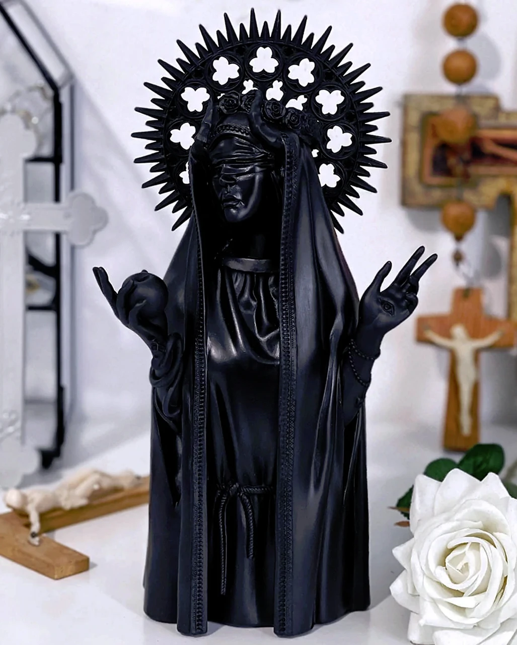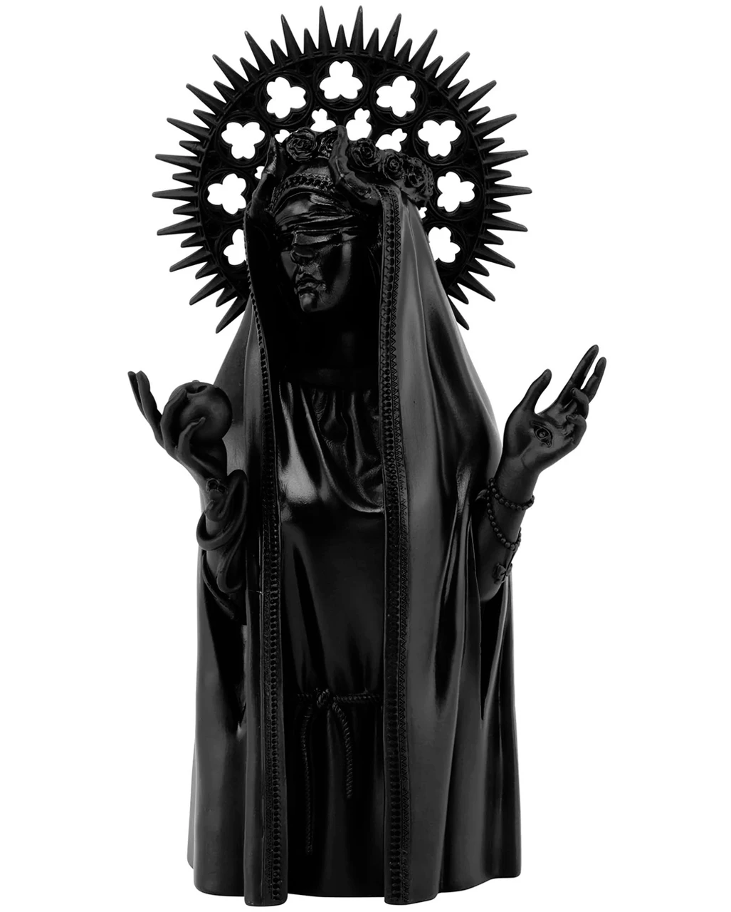 Geheimnisvoll und anmutig – so präsentiert sich diese schwarze Pagan Figur aus Kunststein. Die mystische Statue trägt eine Kutte und hat die Arme zum gebet erhoben. Wen sie wohl heraufbeschwört? Die Unholy Büste von KILLSTAR sorgt in deinem Schrein für einen echten Blickfang.