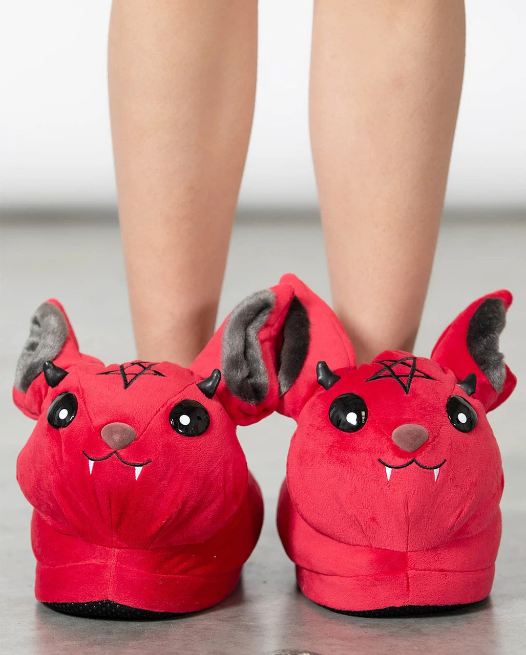 Auch als Gothic Geschenkartikel eine tolle Idee: Die Vampir Hausschuhe KILLSTAR sind in zwei verschiedenen Größen erhältlich. Sie sind blutrot und zeigen als Design zwei niedliche Fledermaus Köpfe aus Plüsch. Kleine Ohren, winzige schwarze Hörner und große runde Augen machen die Persönlichkeit dieser ganz besonderen Fußwärmer aus. Noch mehr Gothic Fashion und kuschelig weiches Zubehör findet ihr hier im Shop.