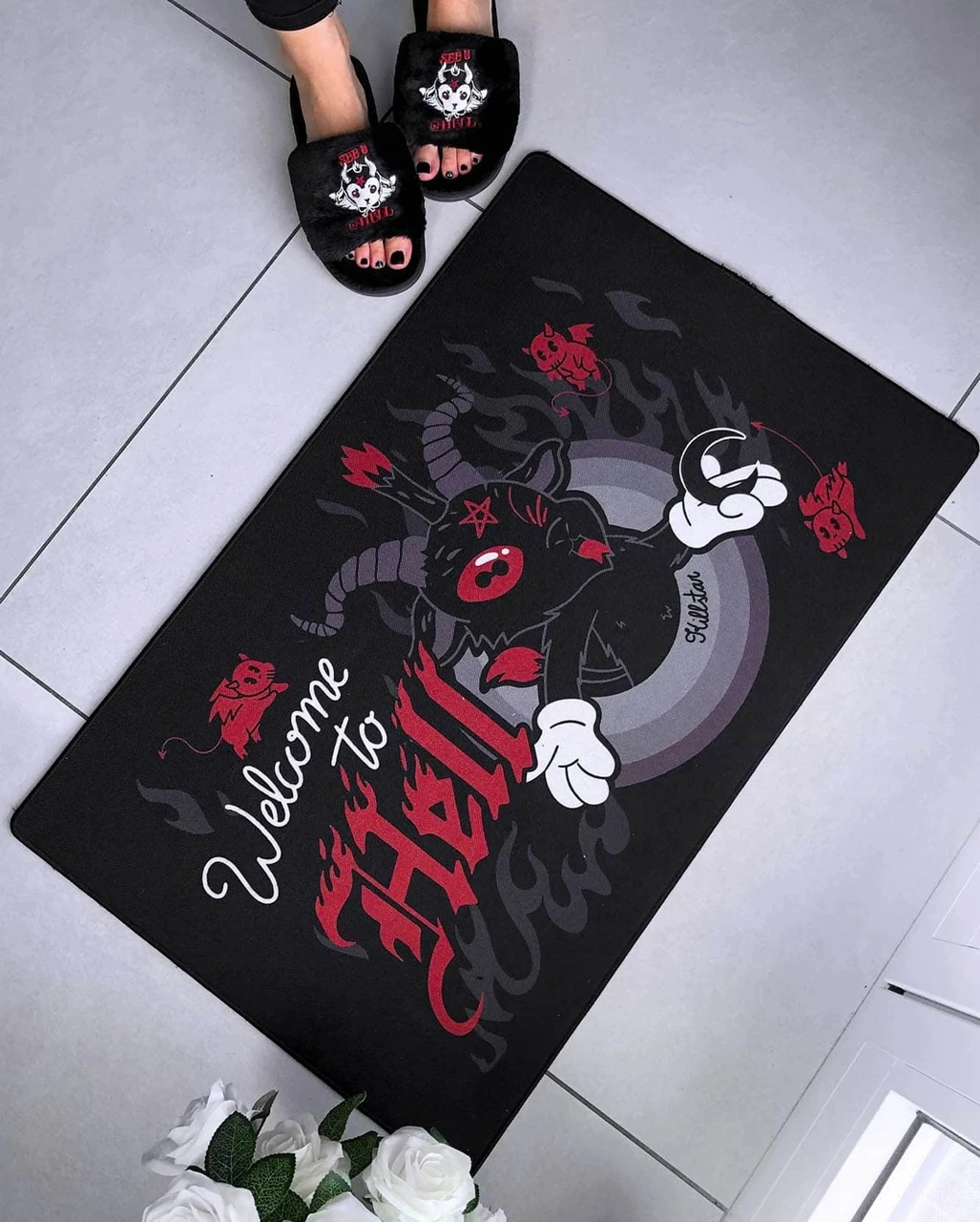 Du suchst die perfekte Türmatte für deine Gruft oder dein Spukhaus? Bitte sehr, du hast sie gefunden: Die bezaubernde Welcome to Hell Fußmatte KILLSTAR ist ein echter Eyecatcher vor deiner Gruft. Lass dich von unserer okkulten Fußmatte auf unheimliche Art und Weise verzaubern. Vor allem bereitest du deinen Besuchern mit unserem genialen Fußabtreter mit der niedlichen Version des Baphomet Ziegenkopfs einen teuflischen Empfang.
