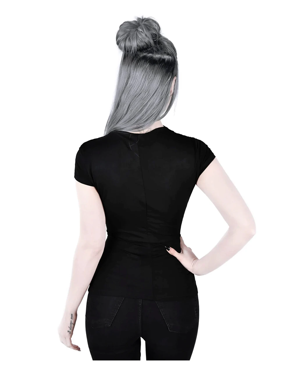 Mit dem Xara Keyhole Top KILLSTAR wirst zum Blickfang für alle, die dir und deinem düsteren Charme erlegen sind. Mit dem Gothic Top mit raffinierten Riemen Akzenten komplettierst du dich und deine Looks auf dunkle Weise. Ganz passend zu deinem alternativen Modestil, der das Charisma deiner besonderen Persönlichkeit ausmacht. Das Gothic Top ist vielseitig wie du und trägt sich perfekt von der Abenddämmerung bis zum Morgengrauen! Kombiniere es mit Röcken, Hosen oder schwarzen Leggings.