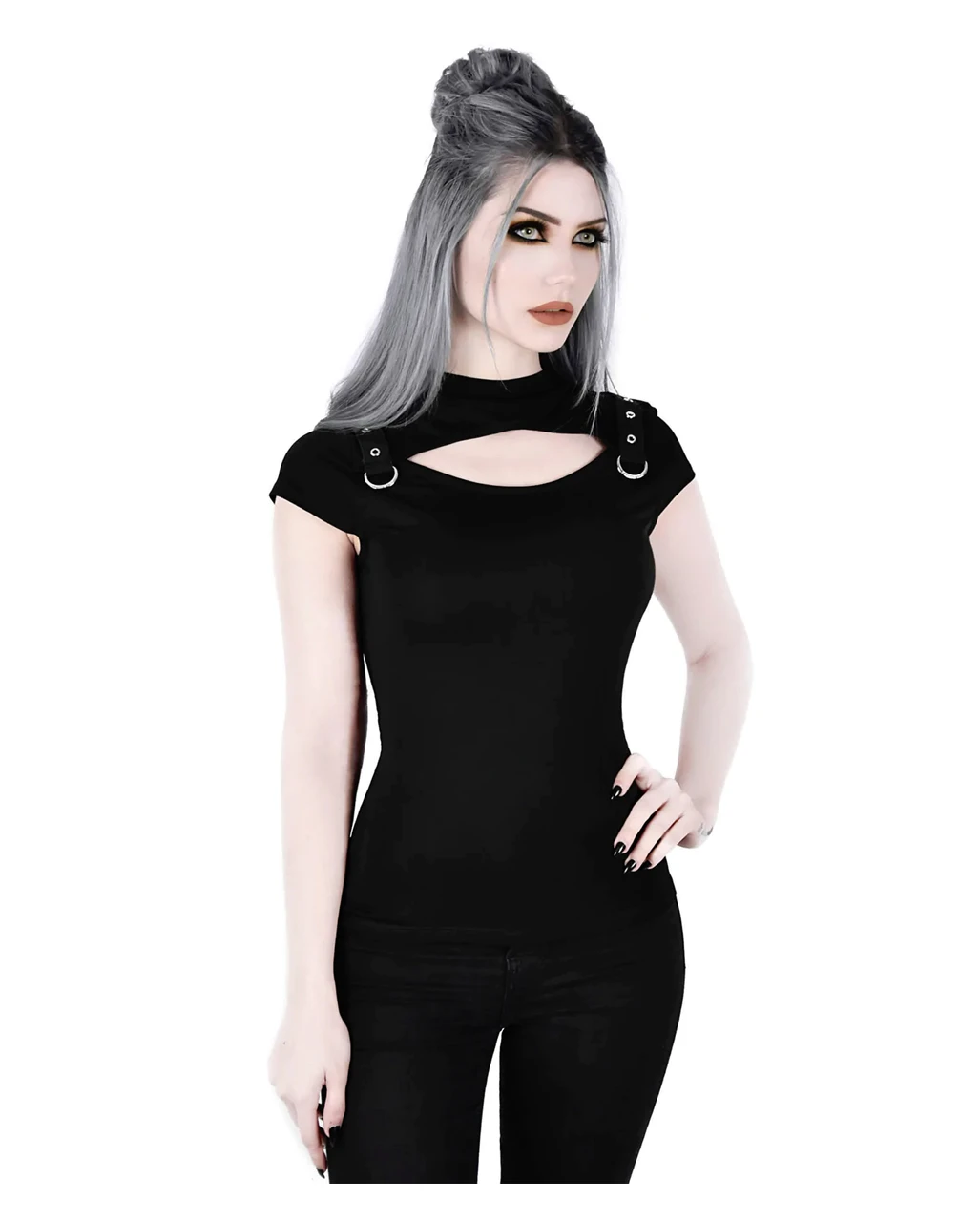 Das Xara Keyhole Top KILLSTAR ist ein schwarzes Gothic Top, das mit einigen besonderen Details aufwartet. Das eng anliegende Shirt, das in vielen Größen erhältlich ist, wurde mit Riemen mit Ösen und D-Ringen an den Schultern ausgestattet. Auch der hohe Keyhole Ausschnitt sorgt für das gewisse Etwas dieser sexy Gothic Fashion. Noch mehr ausgefallene Gothic Damenmode findest du hier im Shop.