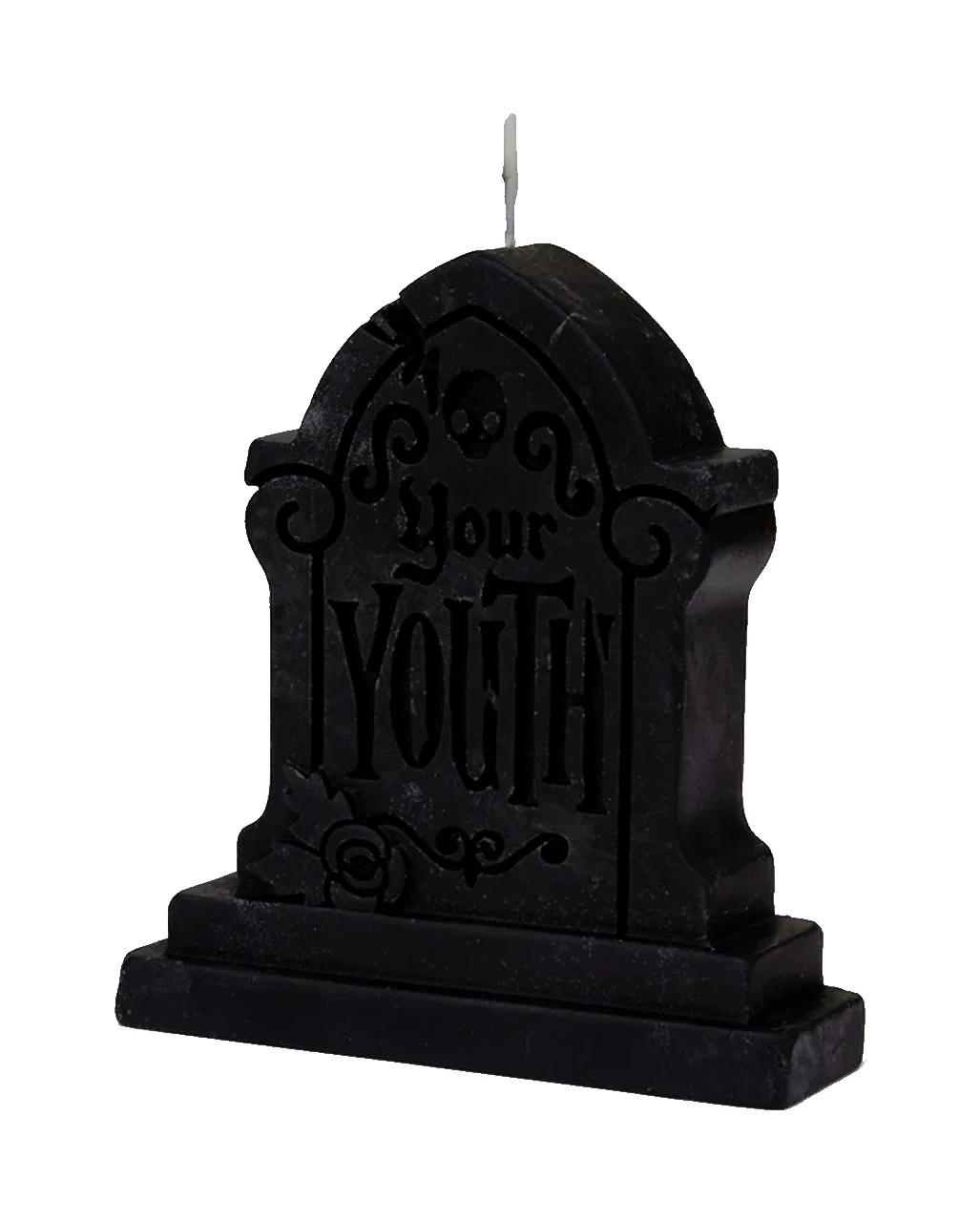 Die Your Youth Motiv Kerze KILLSTAR kommt als geschwungener Grabstein daher und erinnert dich an die Vergänglichkeit des Lebens. Sie besteht aus schwarzem Wachs mit der Gravur: „YOUR YOUTH“. Ein Ornament, eine Rose und ein Totenkopf tauchen ebenfalls im Motiv auf. Diese schwarze Grabstein Kerze für Halloween kommt auf dem Esstisch super zur Geltung und macht auch als morbide Geschenkidee einiges her. Lass dir auch die Sarg Vase groß KILLSTAR nicht entgehen.